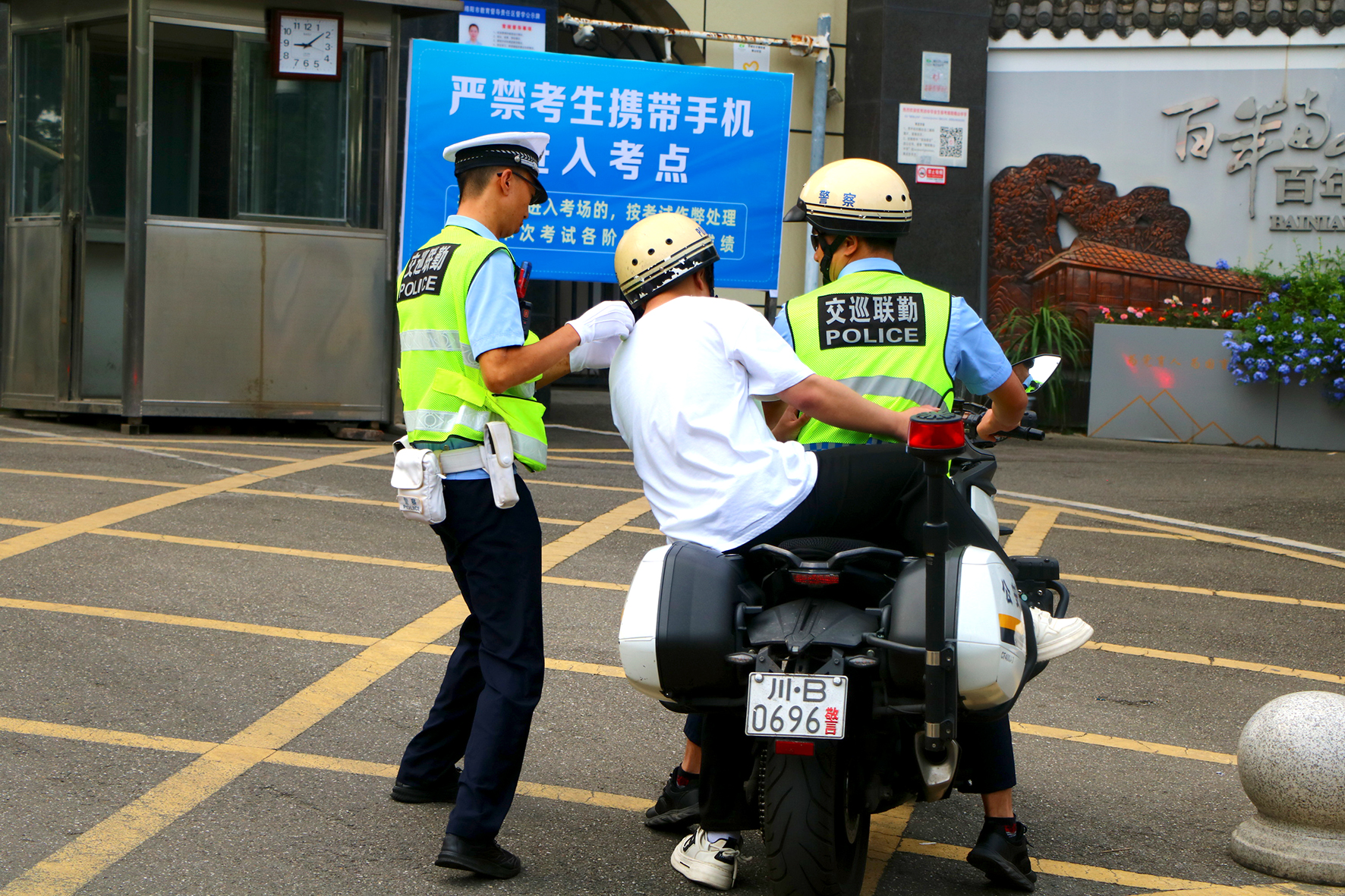 6月12日,四川省綿陽市中考南山中學(xué)考點(diǎn),執(zhí)勤的綿陽市公安局交警支隊(duì)直屬一大隊(duì)民警接到帶隊(duì)老師求助,一位考生不慎將準(zhǔn)考證遺落在學(xué)校。民警立即騎上警摩帶考生往返二十多公里,順利取回準(zhǔn)考證。