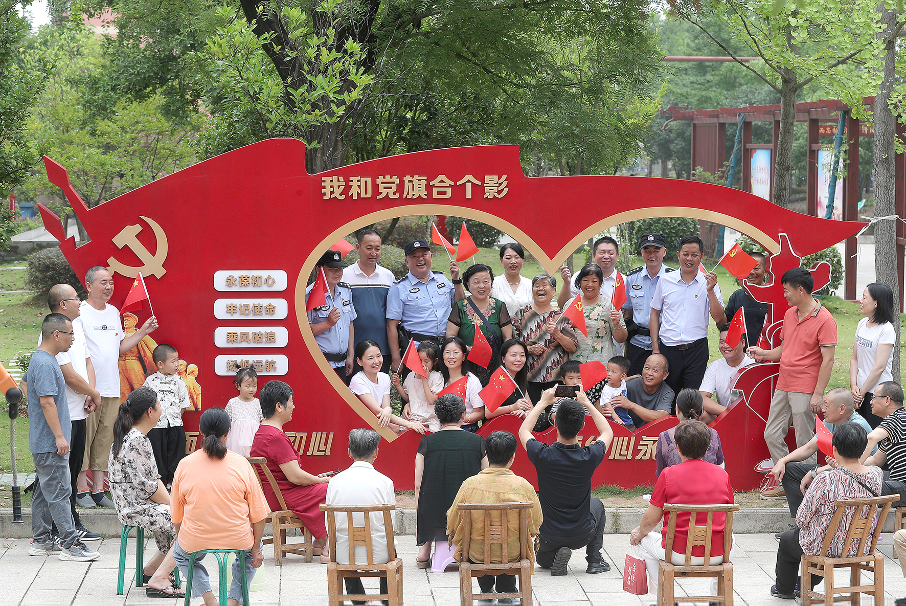 7月1日,湖北省荊門市公安局東寶分局荊泉派出所民警與新橋村老黨員、入黨積極分子及小區(qū)居民,以“我和黨旗合個影”送祝福的方式慶祝中國共產(chǎn)黨成立103周年。