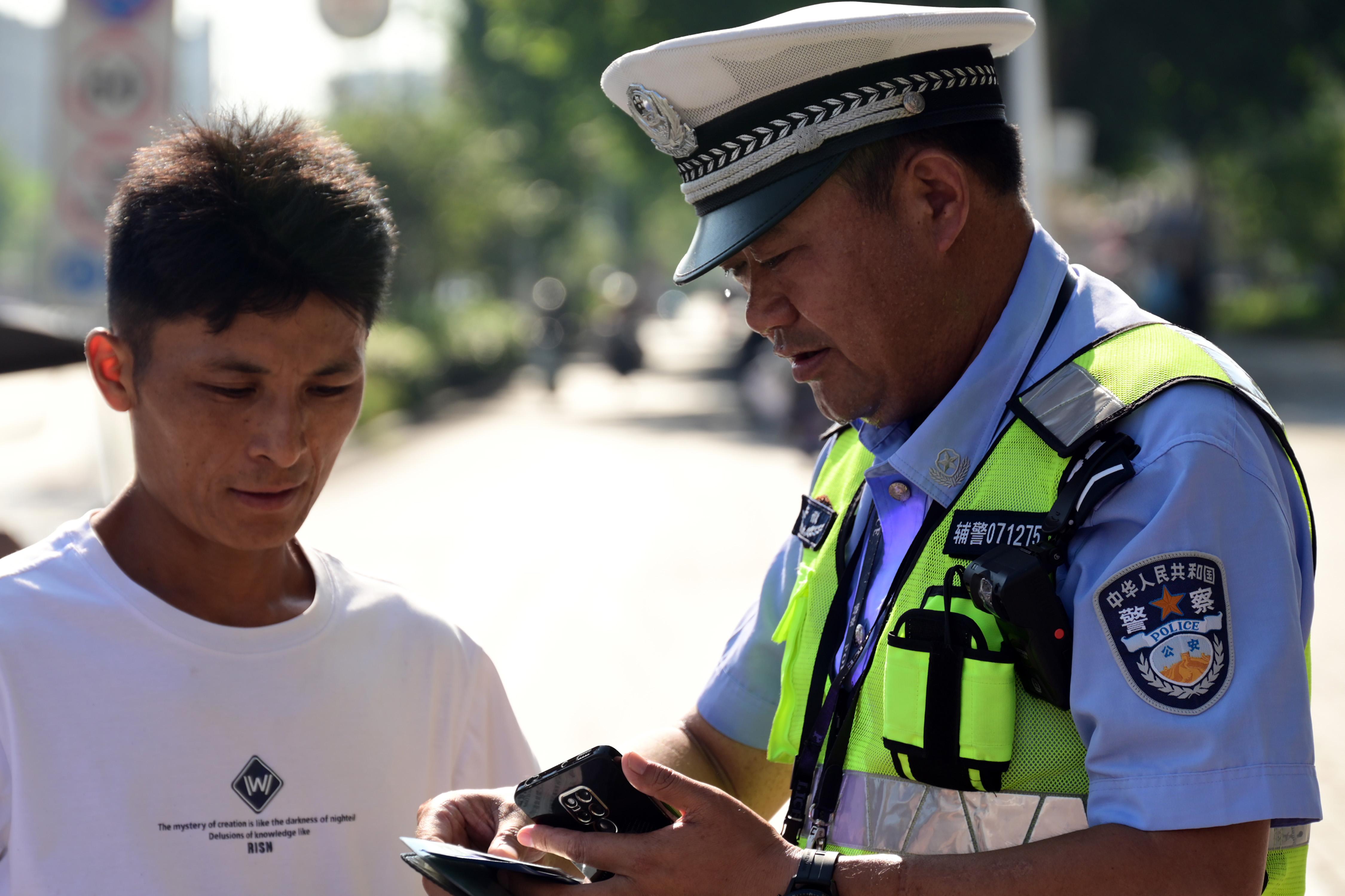 8月5日,安徽省固鎮(zhèn)縣公安局交管大隊(duì)的民警輔警冒著38攝氏度高溫在澮河路指揮疏導(dǎo)交通、提示安全駕駛。