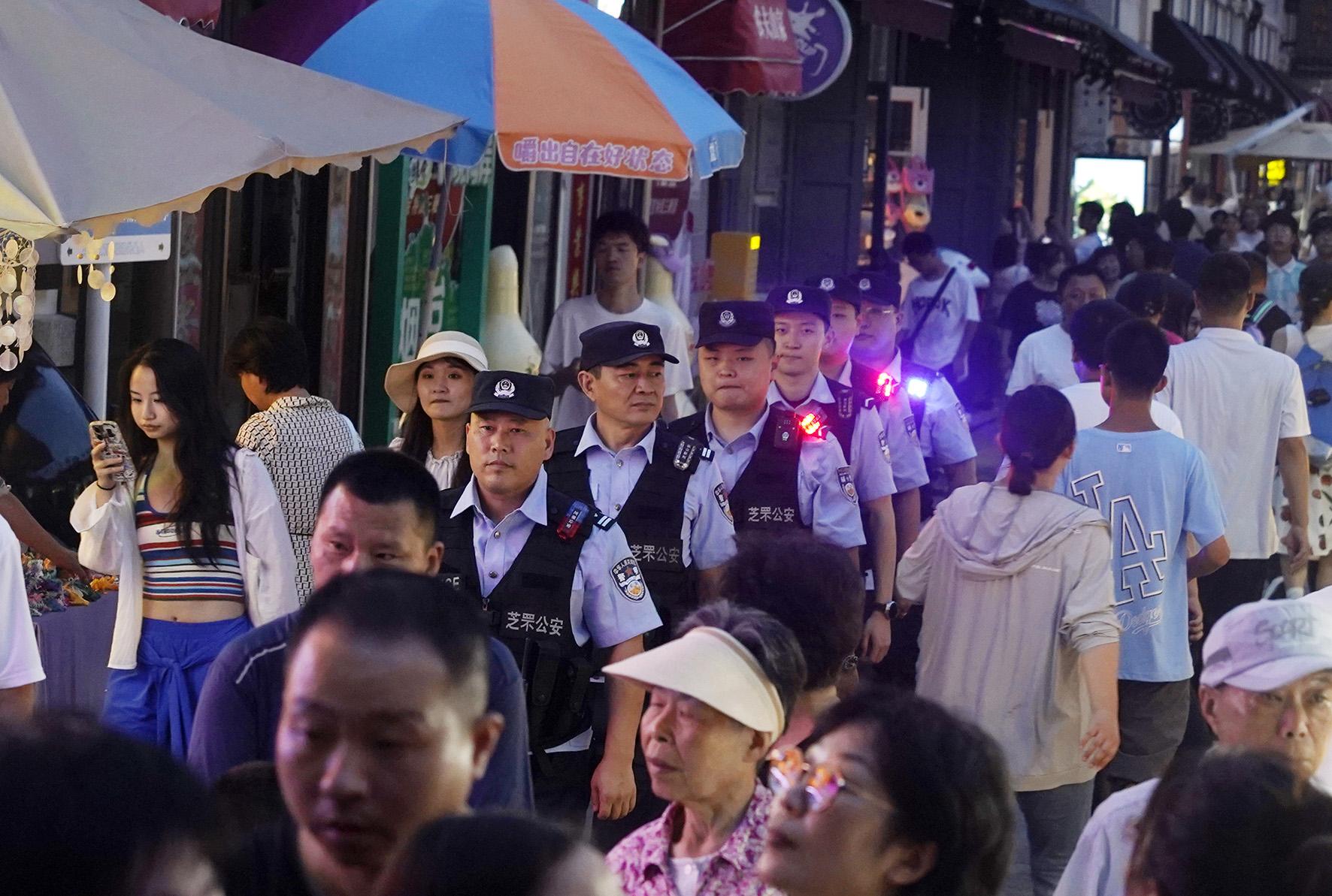 圖為煙臺市公安局芝罘分局民警在朝陽街景區(qū)巡邏。