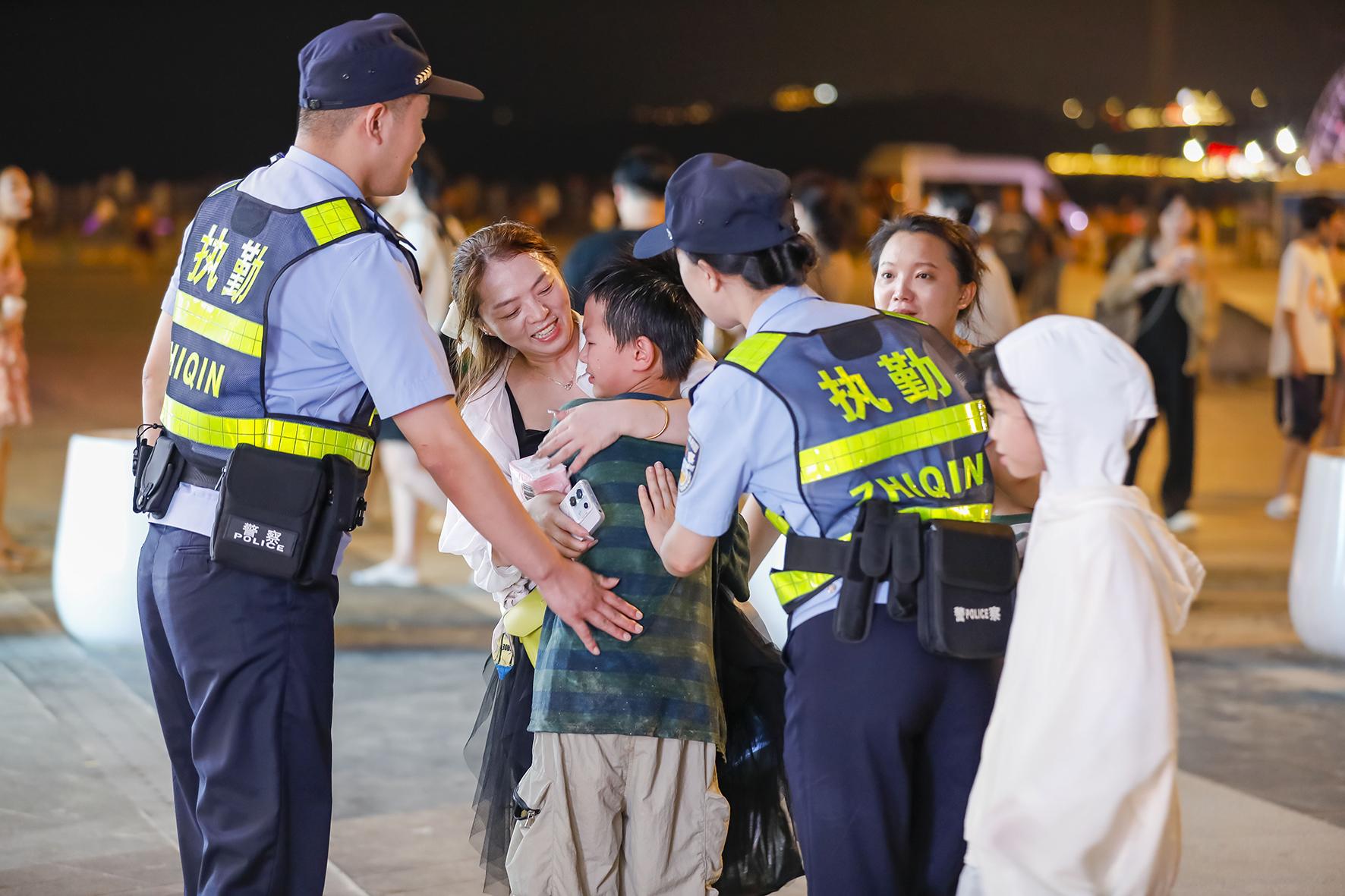 8月11日晚,福建省平潭綜合實驗區(qū)公安局民警在龍王頭海洋公園幫助一名走失的兒童找到家長。