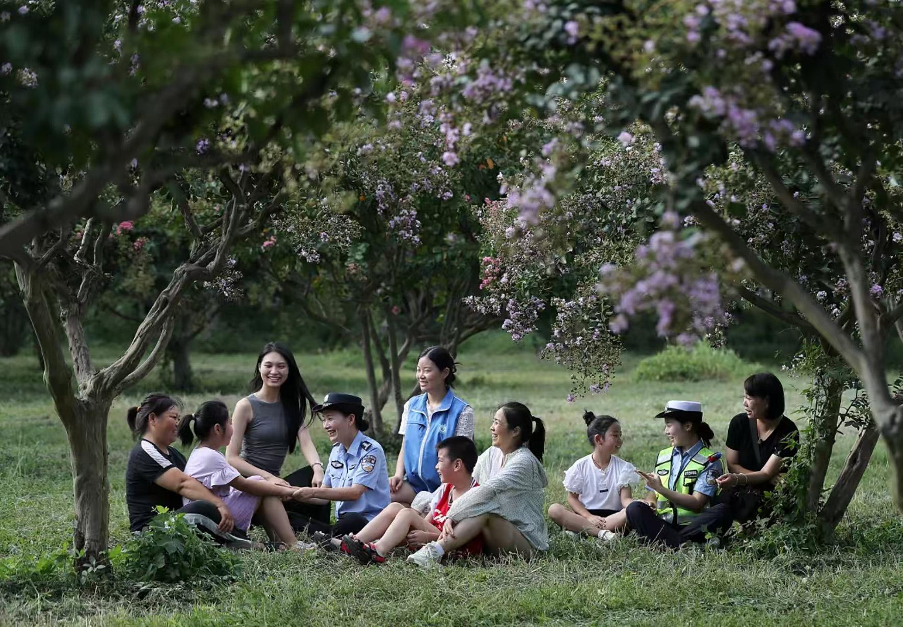 8月15日,湖北省鐘祥市公安局“巾幗護(hù)蕾”小分隊在皇莊街道皇城社區(qū)通過心理團(tuán)體輔導(dǎo)游戲,向社區(qū)婦女和兒童普及未成年人心理健康教育知識。