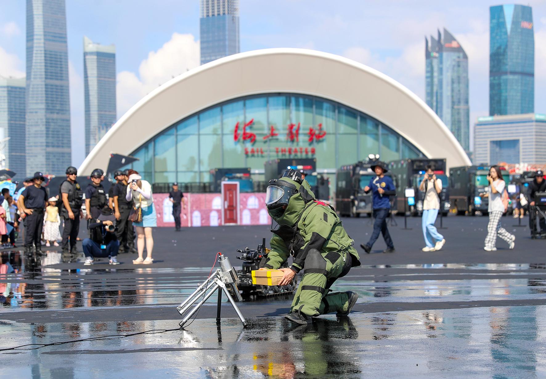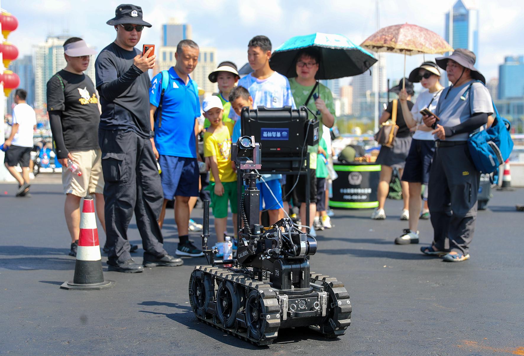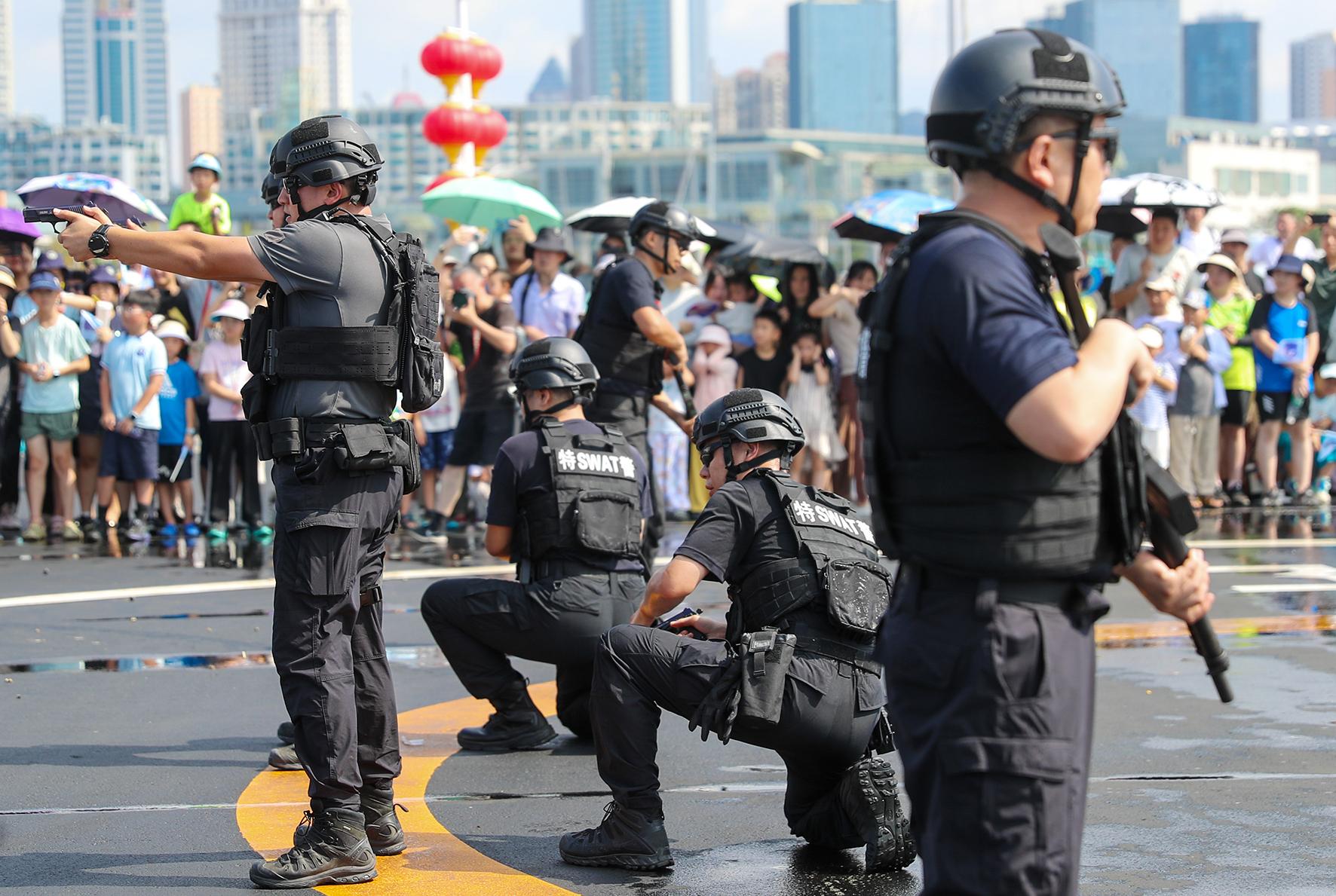 8月18日,山東省青島市公安局特警警營開放日活動在青島奧林匹克帆船中心舉行,相關(guān)警種設(shè)置展臺與市民互動,并進行警務技能演示和警務裝備展示。