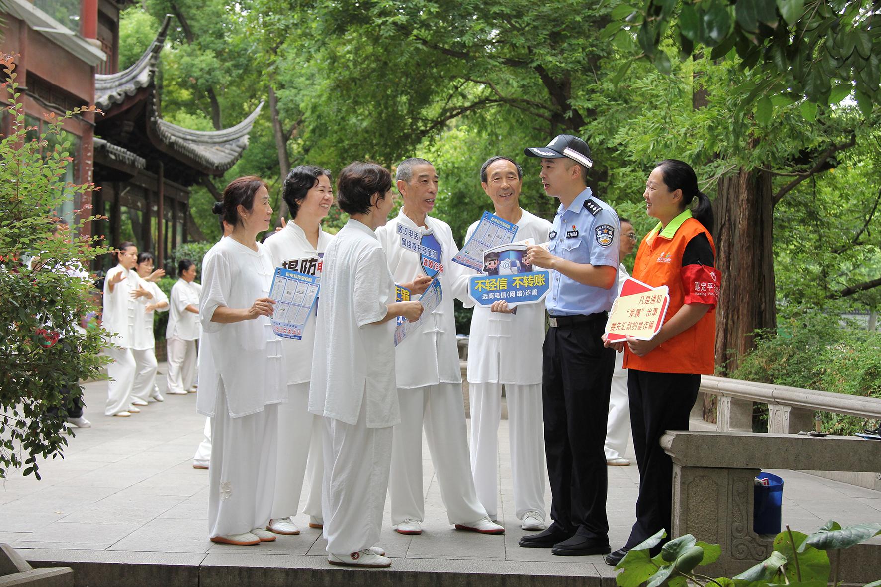 8月27日清晨,上海市公安局嘉定分局嘉城派出所民警與平安志愿者在轄區(qū)匯龍?zhí)豆珗@,向參加太極拳友會(huì)的中老年晨練者講解反詐知識(shí)。