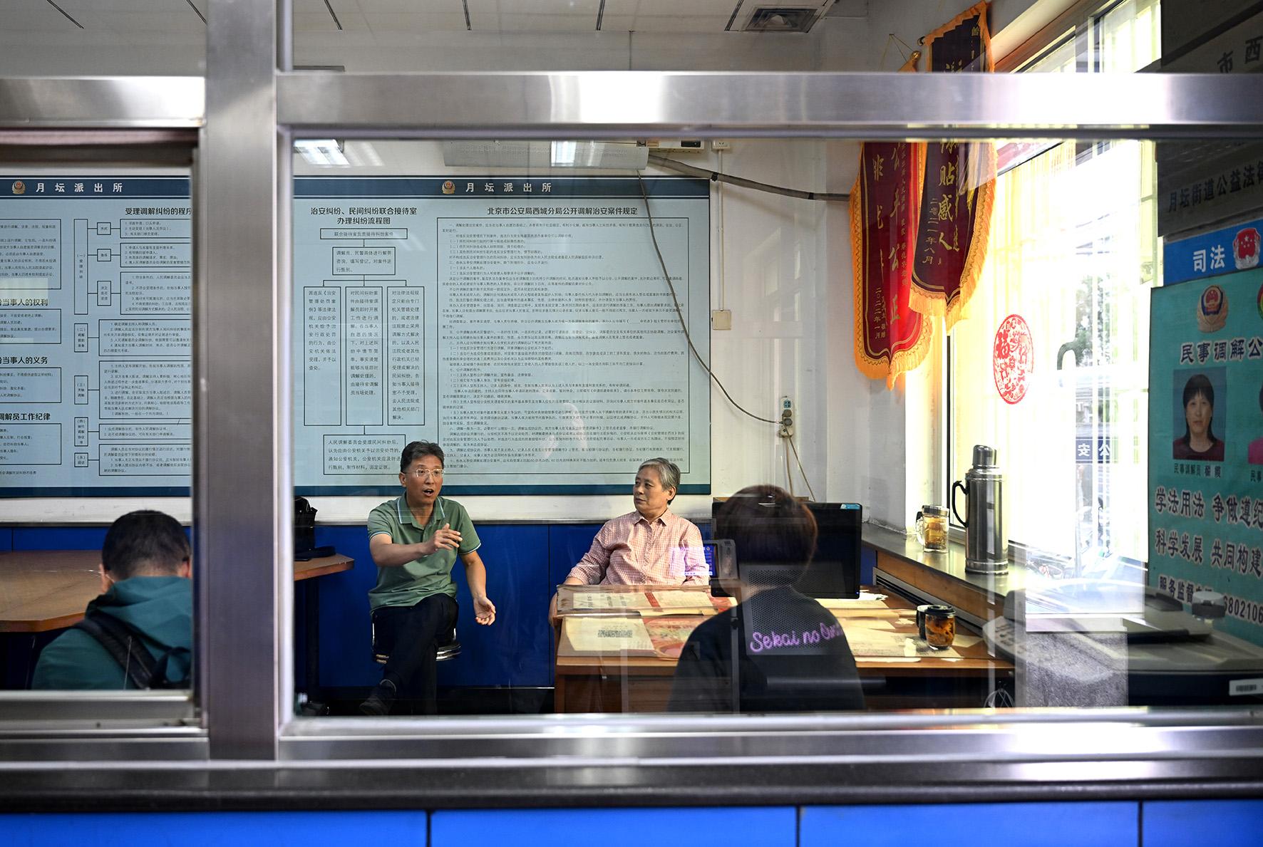 在月壇派出所調(diào)解室,法官趙海(中)圍繞人民調(diào)解協(xié)議中常見糾紛類型、遇到的共性問題給兩位調(diào)解員進(jìn)行專業(yè)指導(dǎo)。