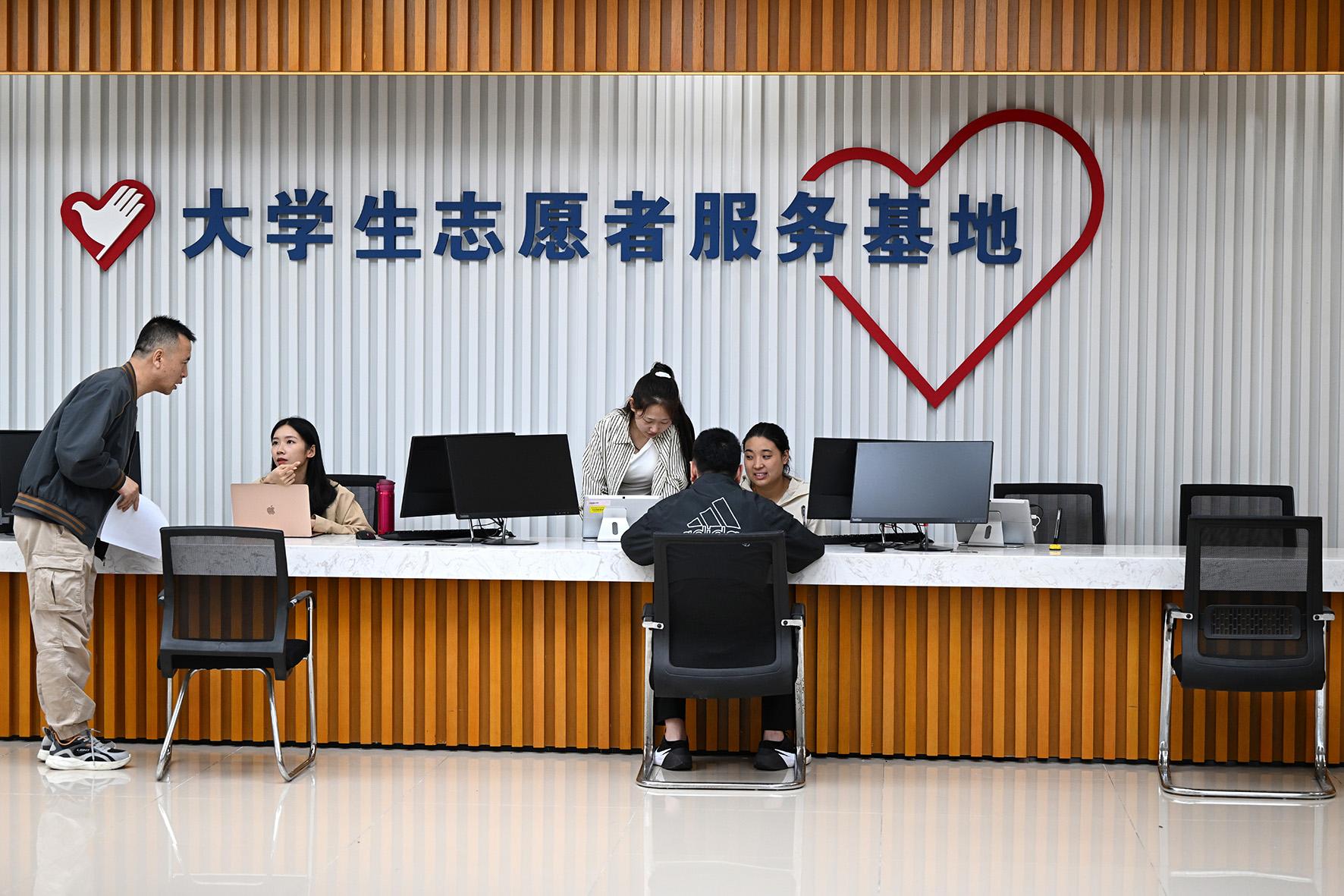大學(xué)生志愿者正在為群眾解答相關(guān)法律問題。2008年,西城區(qū)人民法院與中國政法大學(xué)合作,設(shè)立全國首家志愿者服務(wù)基地。