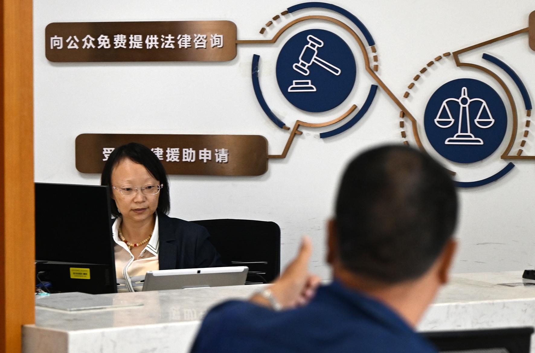 一名群眾的咨詢得到滿意解答后,高興地向法援律師豎起大拇指表示感謝。2015年起,西城區(qū)司法局法援中心律師每周定時來法院提供訴訟咨詢、代寫文書及法律援助服務(wù)。