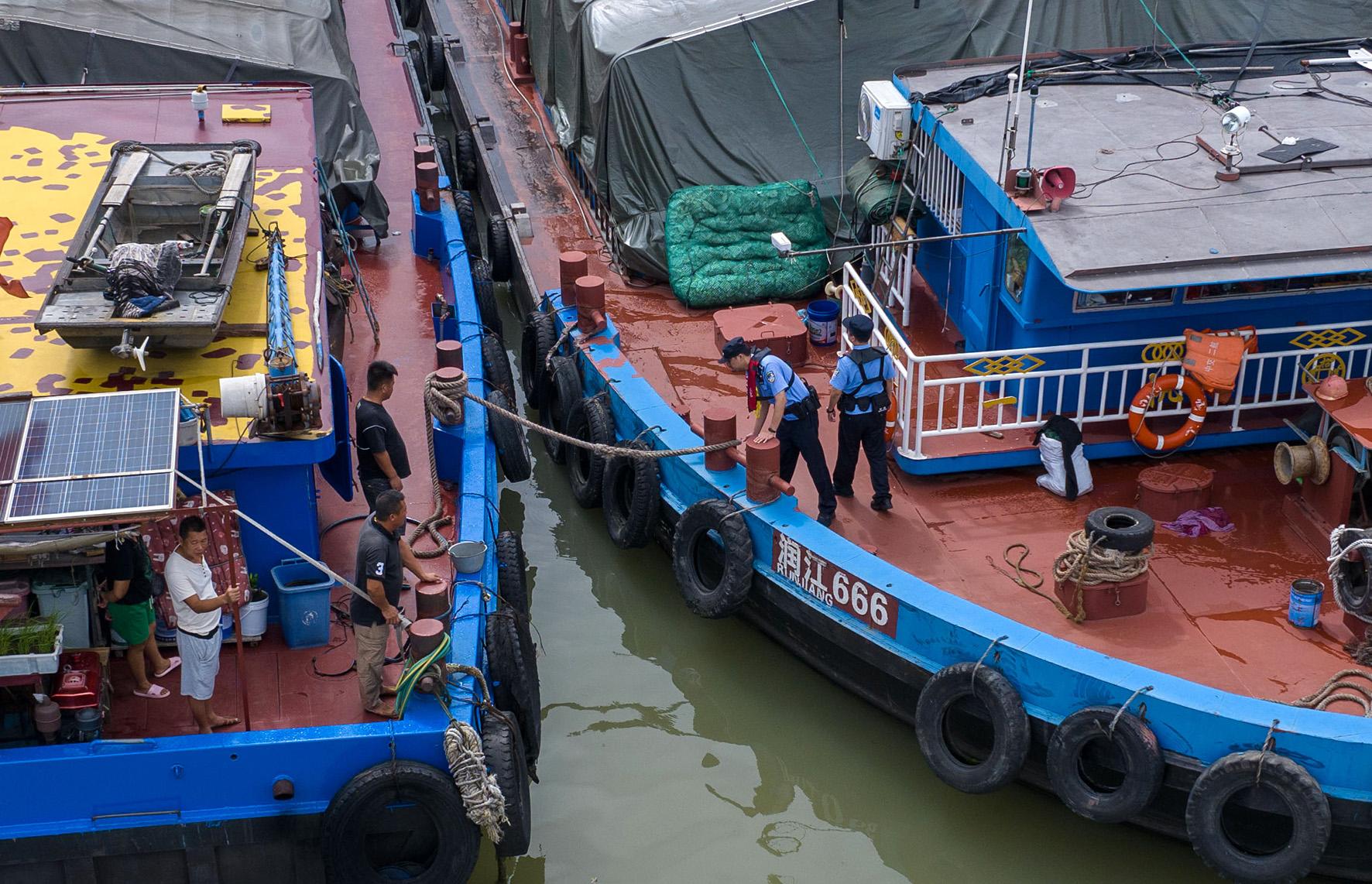 9月20日,長江航運公安局鎮(zhèn)江分局鎮(zhèn)江派出所水上巡邏隊民警在江蘇省鎮(zhèn)江市大港碼頭港池內(nèi)開展安全隱患排查,以應(yīng)對臺風(fēng)“普拉桑”再次來襲。