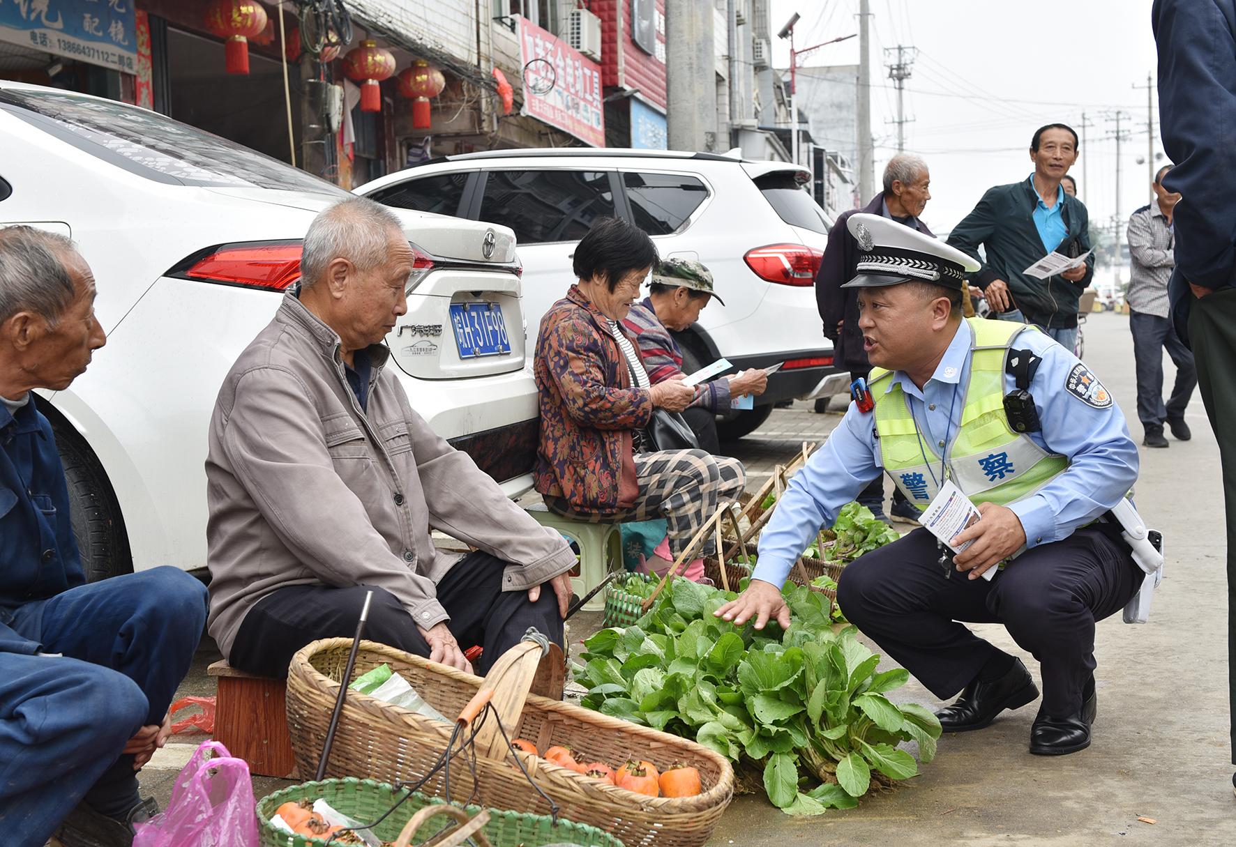 10月15日,安徽省宿松縣公安局交警大隊(duì)民輔警深入農(nóng)村集鎮(zhèn),對二郎街路邊擺攤的菜農(nóng)和商戶開展交通安全宣傳,提示擺攤時(shí)切勿占道影響交通通行和安全,并做好安全防護(hù)。