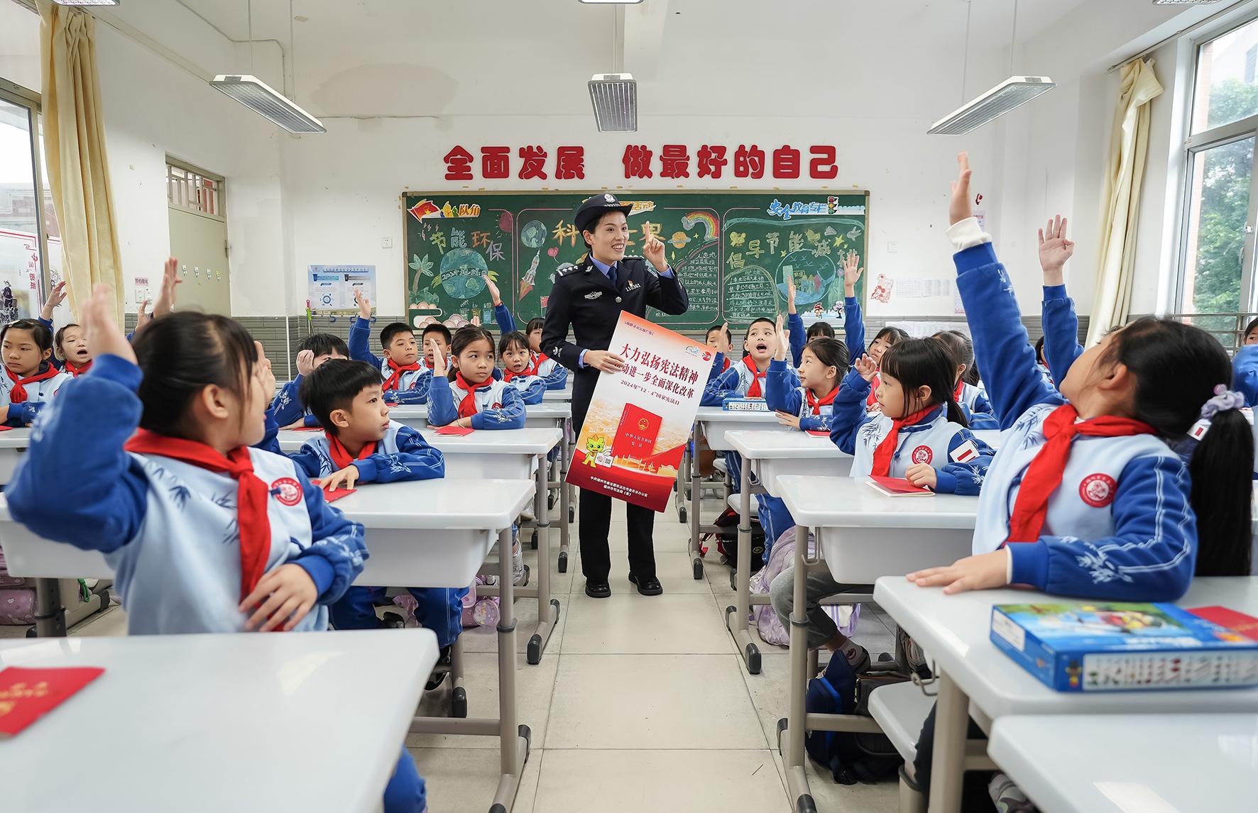 12月2日,安徽省廣德市公安局升平派出所社區(qū)民警來到桃州鎮(zhèn)第四小學為學生輔導學習憲法知識。