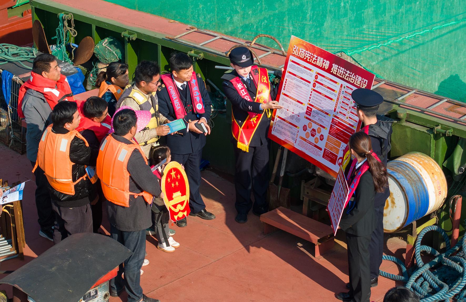 12月2日,長江航運公安局鎮(zhèn)江分局鎮(zhèn)江派出所聯合海事、法院等江蘇省鎮(zhèn)江市船員法律援助站成員單位,在長江江蘇鎮(zhèn)江段開展憲法上船頭活動。