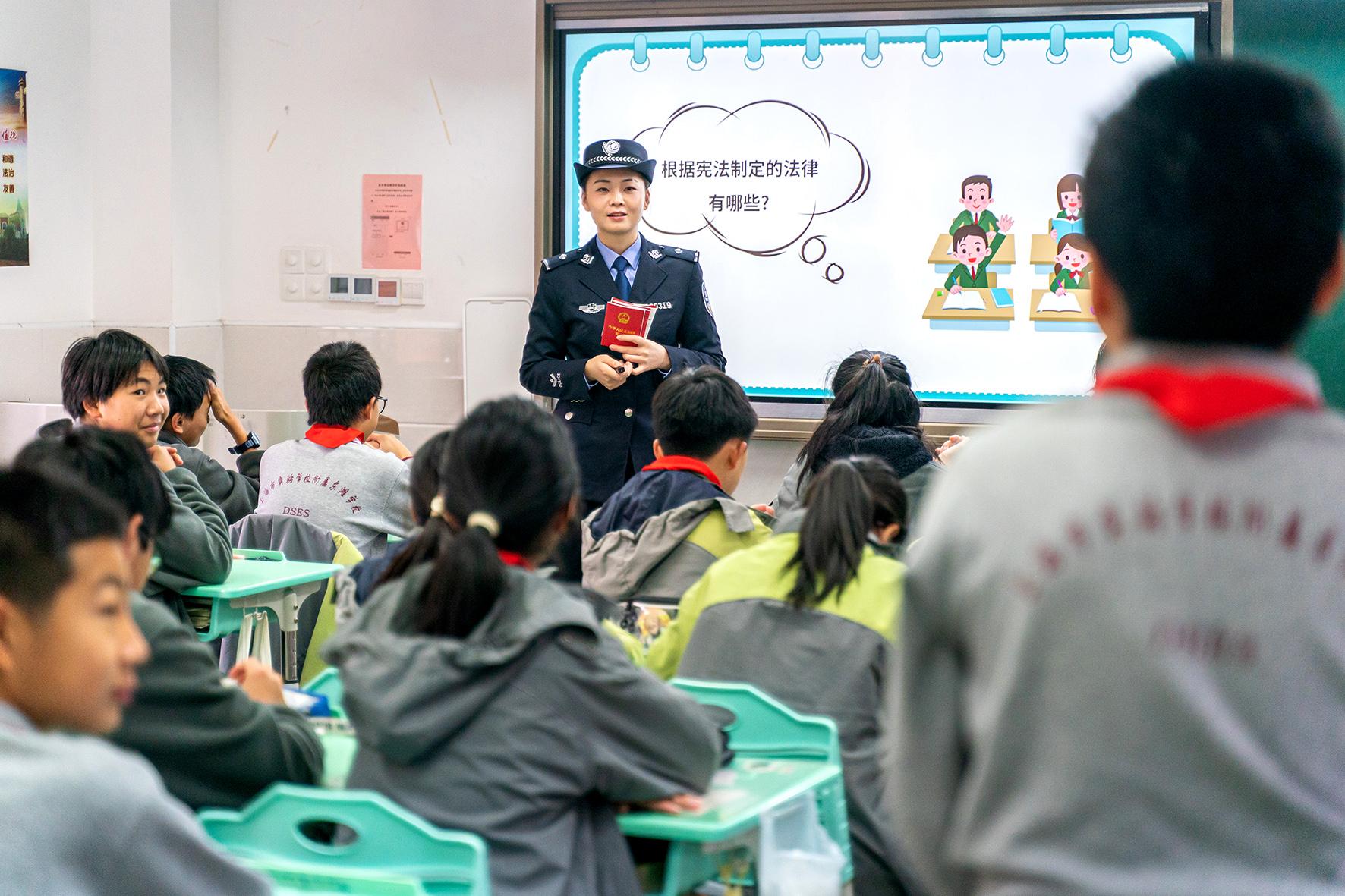 12月3日,上海市公安局崇明分局陳家鎮(zhèn)派出所組織民警來到轄區(qū)東灘實驗學校,向同學們普及憲法知識。