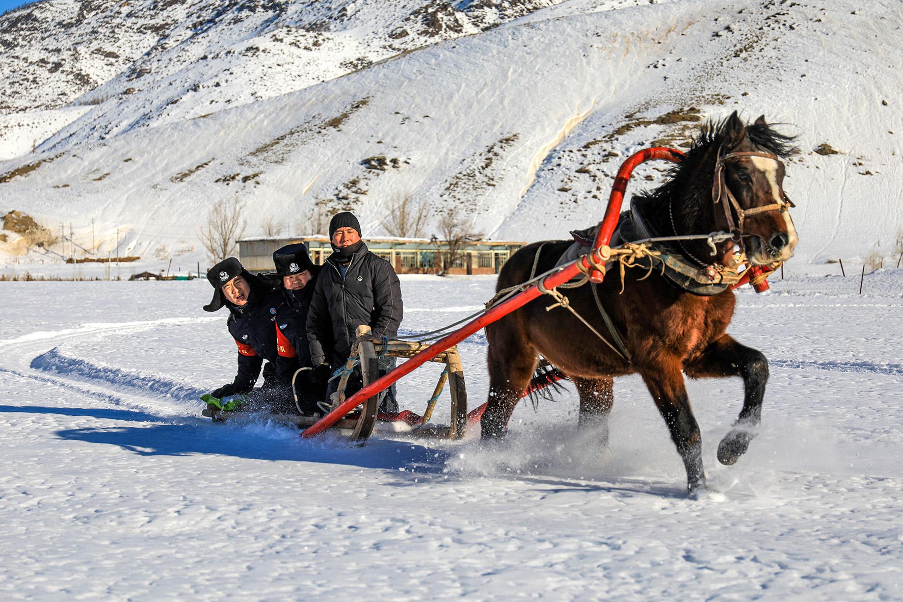 12月8日,新疆阿勒泰地區(qū)因降雪給部分村莊農(nóng)戶日常出行造成不便。新疆出入境邊防檢查總站阿勒泰邊境管理支隊(duì)庫衛(wèi)邊境派出所民警和護(hù)邊員采取馬拉爬犁的方式,走訪轄區(qū)群眾,梳理群眾困難需求,并對(duì)困難農(nóng)戶開展冬季慰問,保障轄區(qū)群眾平安過冬。