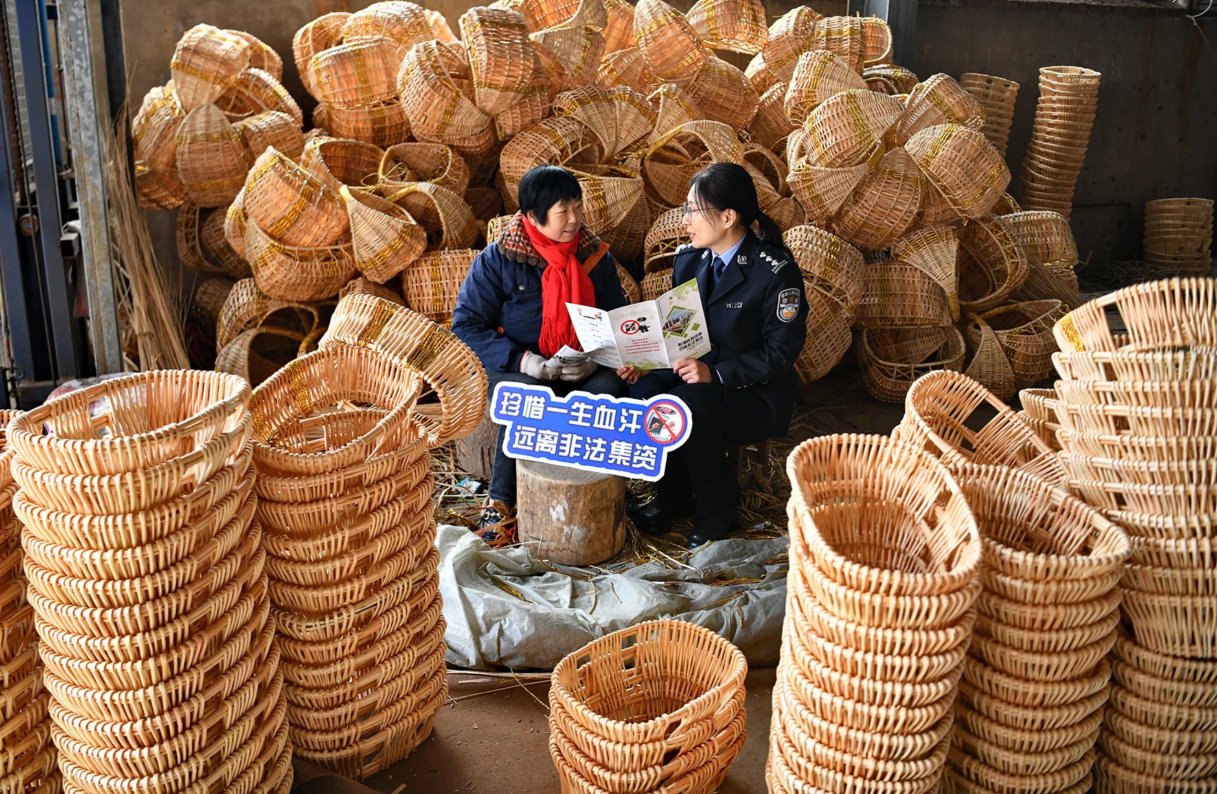 12月11日,安徽省阜南縣公安局郜臺派出所民警在轄區(qū)一柳編企業(yè)向工人宣講防騙知識。阜南縣公安局經(jīng)偵大隊(duì)聯(lián)合郜臺派出所開展“冬季送平安 送法進(jìn)企業(yè)”冬季行動宣傳。