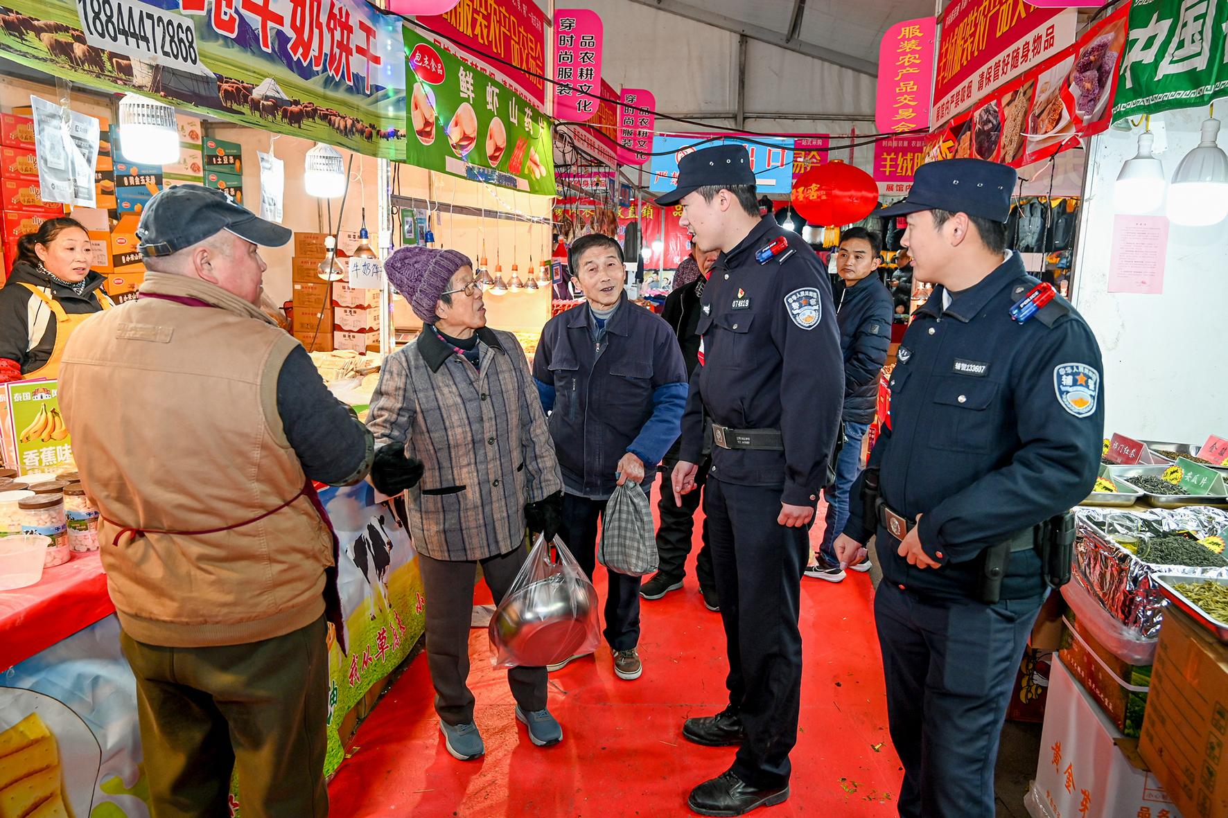 1月5日晚,安徽省馬鞍山市和縣公安局民警在新春購物節(jié)活動(dòng)現(xiàn)場巡邏,保障現(xiàn)場安全有序。