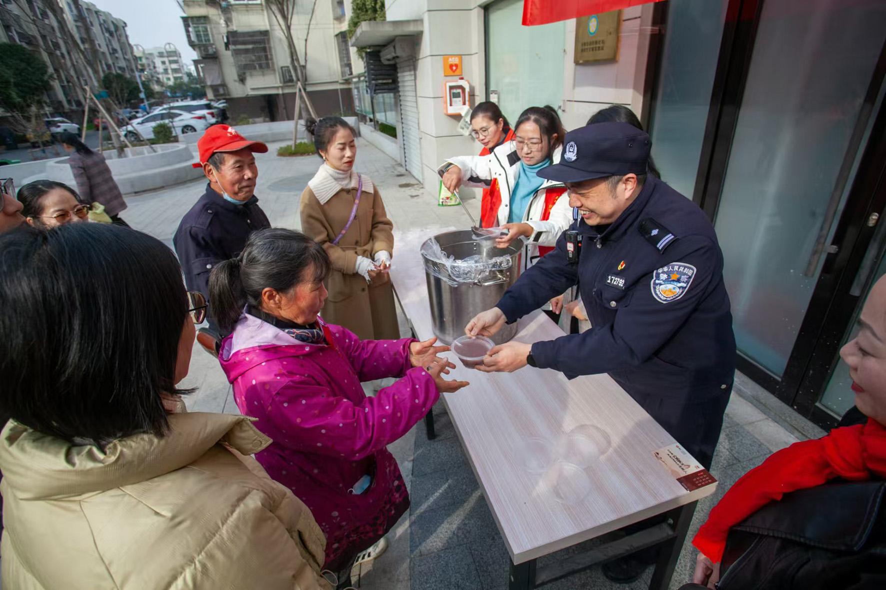 1月7日,浙江省臺州市公安局黃巖分局城東派出所民警和東城街道白楊社區(qū)工作人員一起,在白楊社區(qū)內開展分發(fā)八寶粥活動,并進行安全防范宣傳。