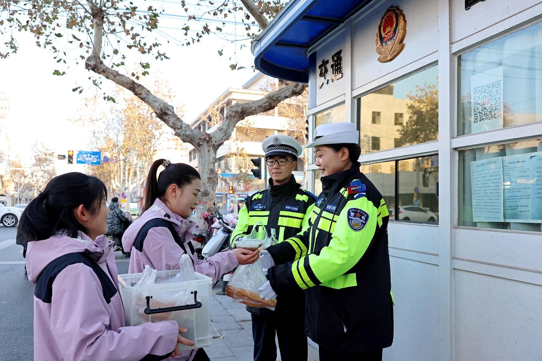 1月7日,山東省棗莊市市中區(qū)文化路絲雨幼兒園老師向崗亭值班的交通輔警送上臘八粥。