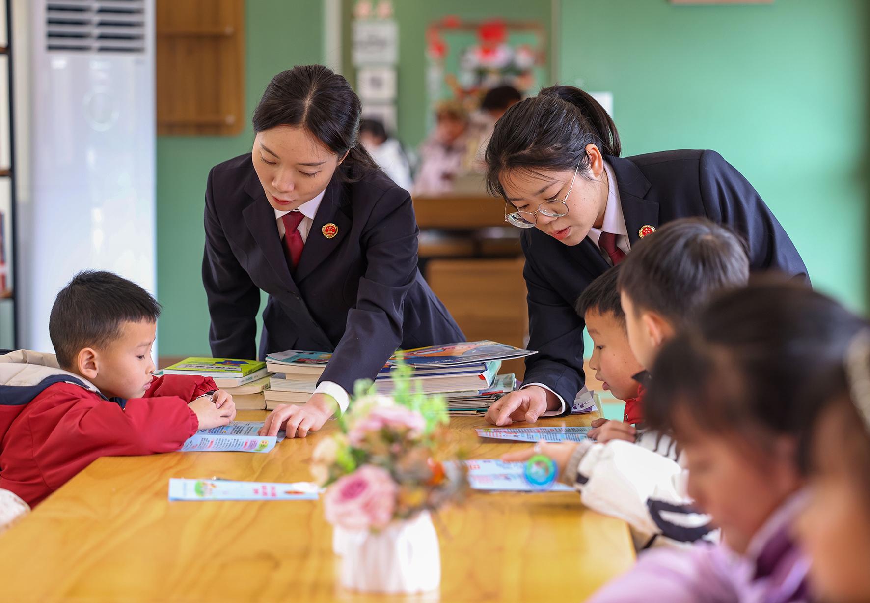 圖為檢察干警在紫氣山社區(qū)書屋給小朋友宣傳未成年人保護法律知識。