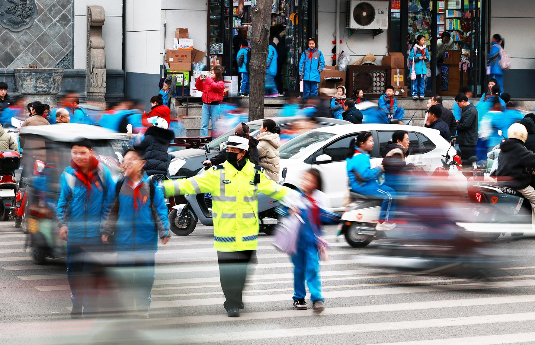 2月18日,山西省運(yùn)城市新絳縣交警大隊(duì)古城中隊(duì)“學(xué)雷鋒”護(hù)學(xué)崗一名輔警在西街實(shí)驗(yàn)小學(xué)校門口護(hù)送小學(xué)生安全通過(guò)斑馬線。
