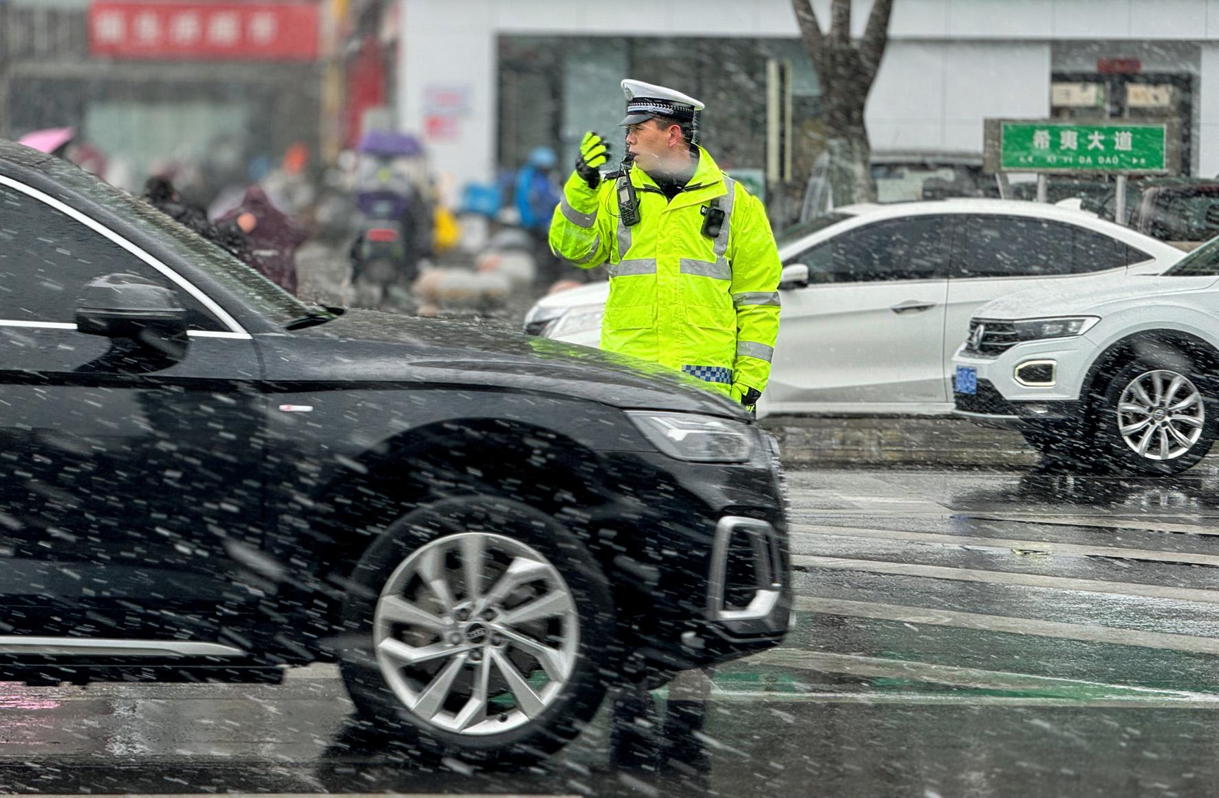 3月3日,安徽省阜南縣公安局交管大隊民警冒著風雪在城區(qū)一小學門口維持交通秩序。