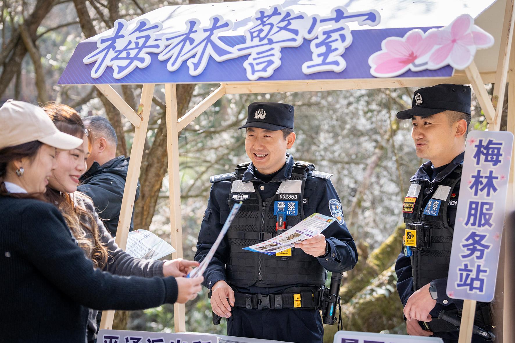 3月19日,四川省綿陽市平武縣公安局在梅林景區(qū)設(shè)立的梅林警室,向游客宣講反詐、防火等知識。