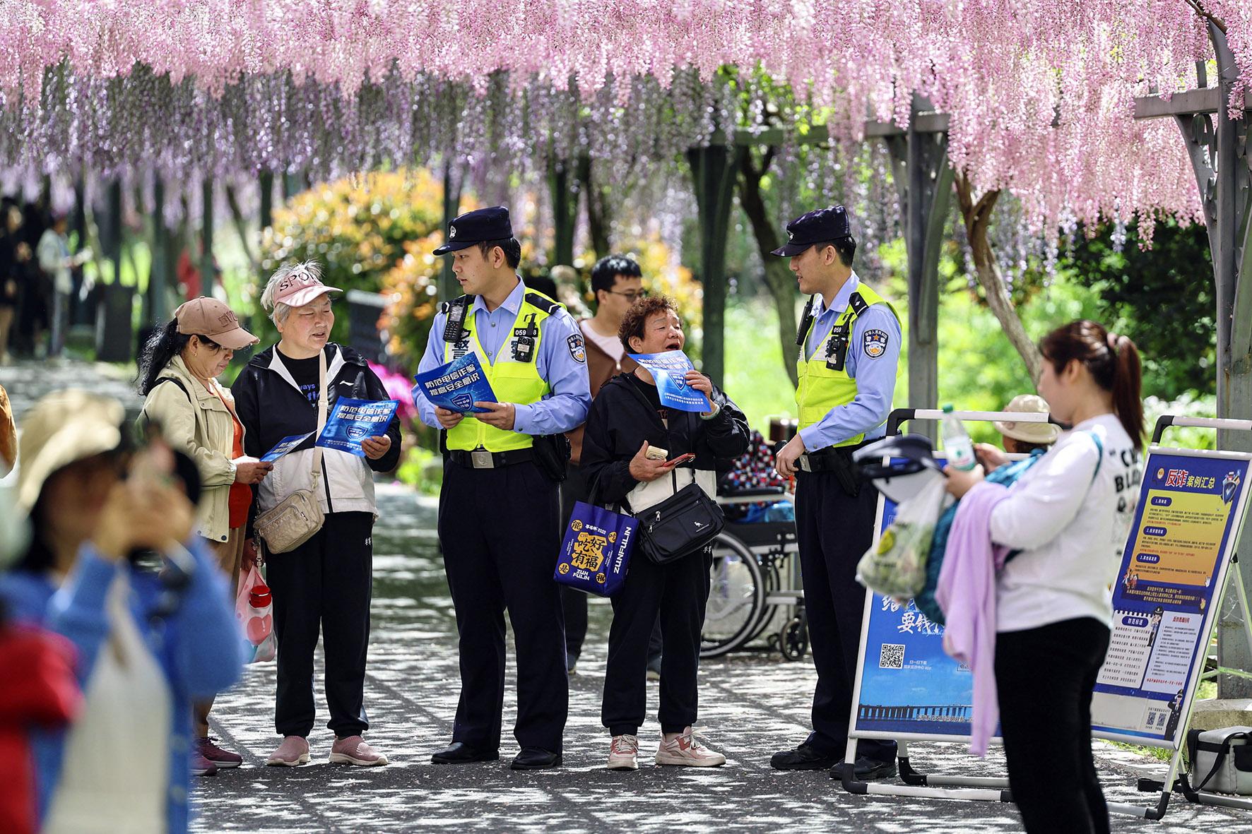 4月25日,上海市公安局崇明分局建設(shè)派出所民警來到東平國家森林公園紫藤長廊開展常態(tài)化巡邏和防范電信網(wǎng)絡(luò)詐騙宣傳,守護(hù)游客平安。