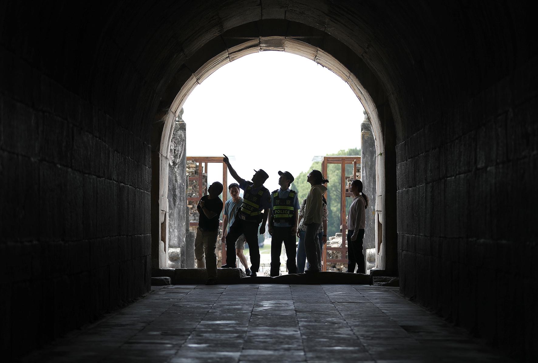 5月13日,在世界文化遺產(chǎn)湖北省鐘祥市明顯陵,鐘祥市公安局皇莊水陸派出所民警在巡查過程中化身“普法導(dǎo)游”,一邊為游客介紹明代皇家陵寢的獨(dú)特魅力,一邊積極宣傳新修訂的《中華人民共和國文物保護(hù)法》知識。
