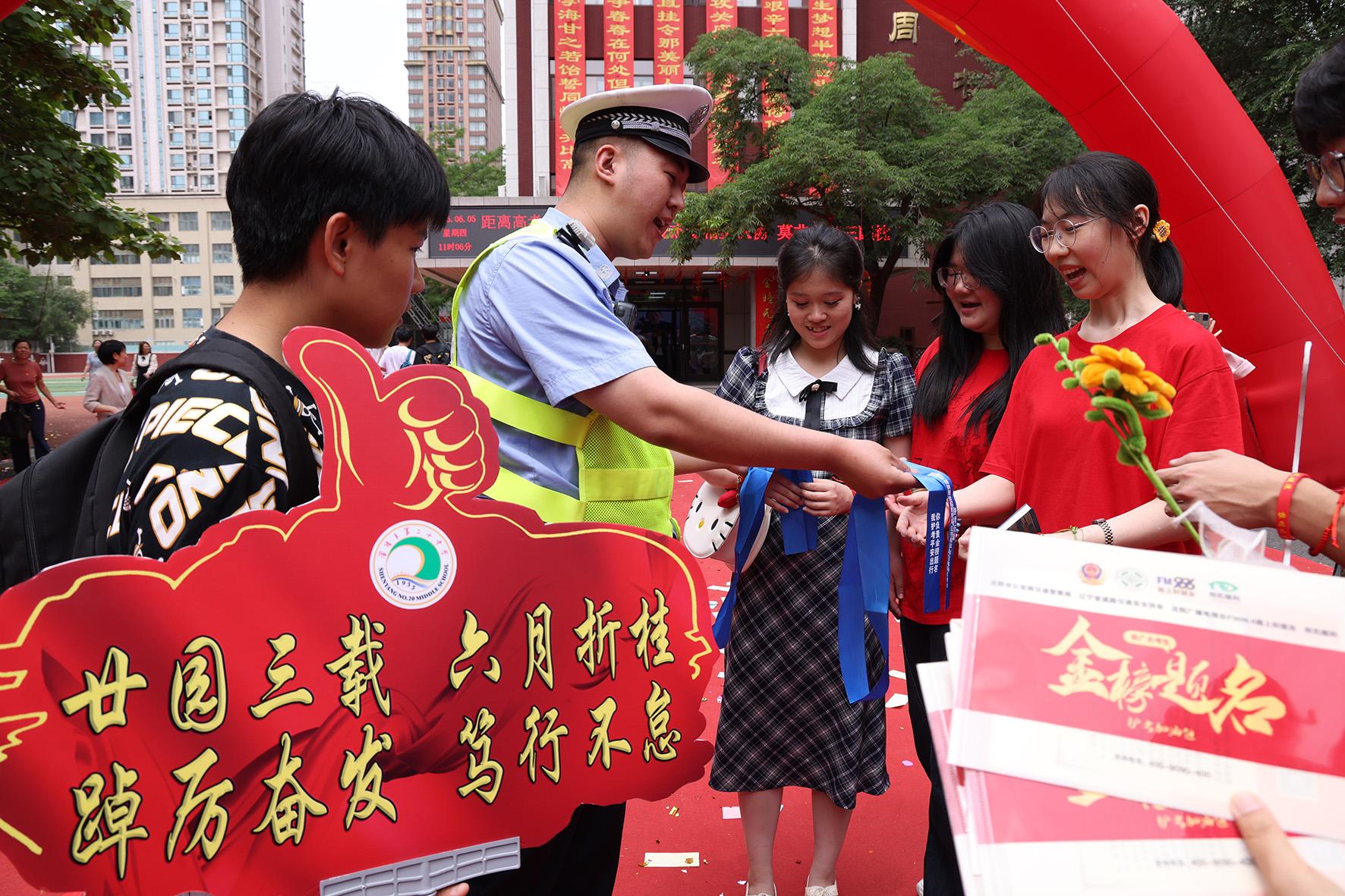 6月5日,遼寧省沈陽市公安局交通管理支隊和平大隊民警來到學校將護考“藍絲帶”送到考生手中,系有“藍絲帶”的車輛予以優(yōu)先放行,并倡導社會車輛主動讓行“藍絲帶”送考車輛。