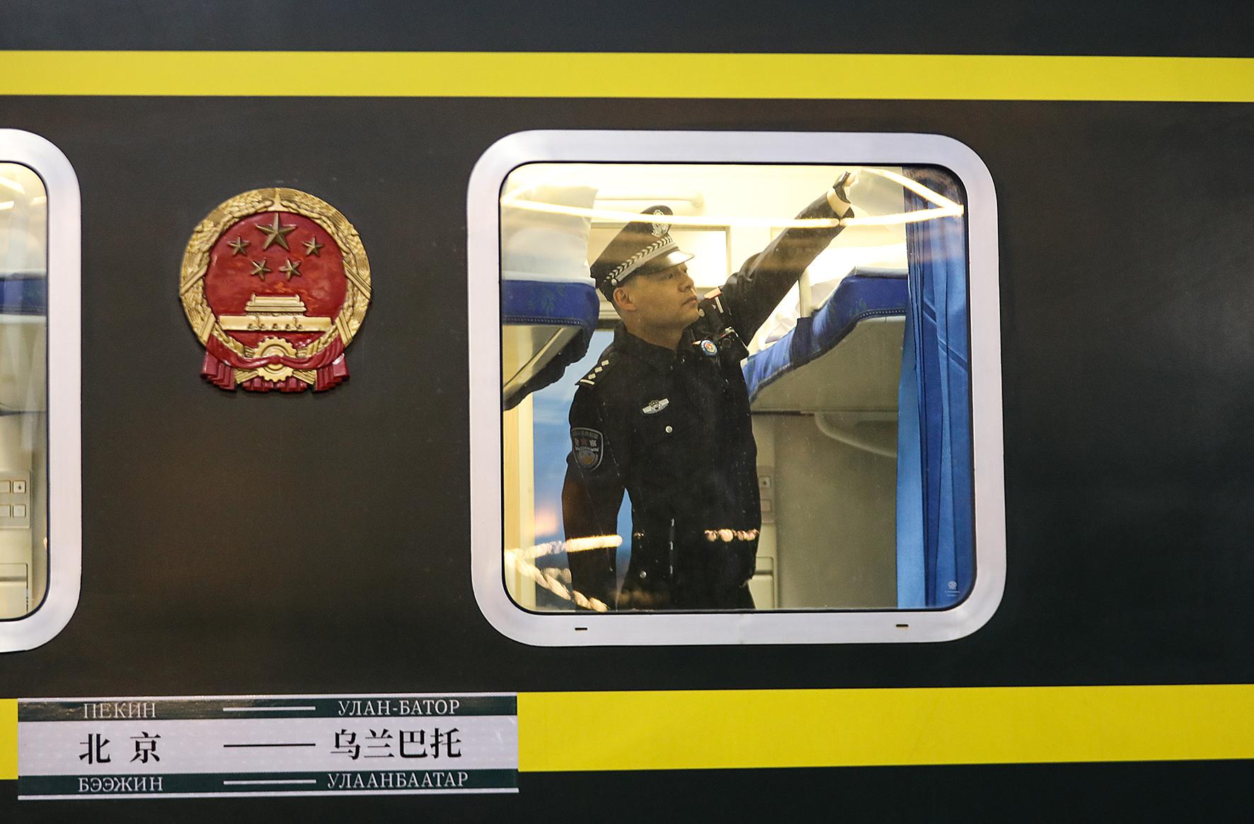 圖為二連出入境邊防檢查站移民管理警察正在查驗(yàn)K23次國際旅客列車。