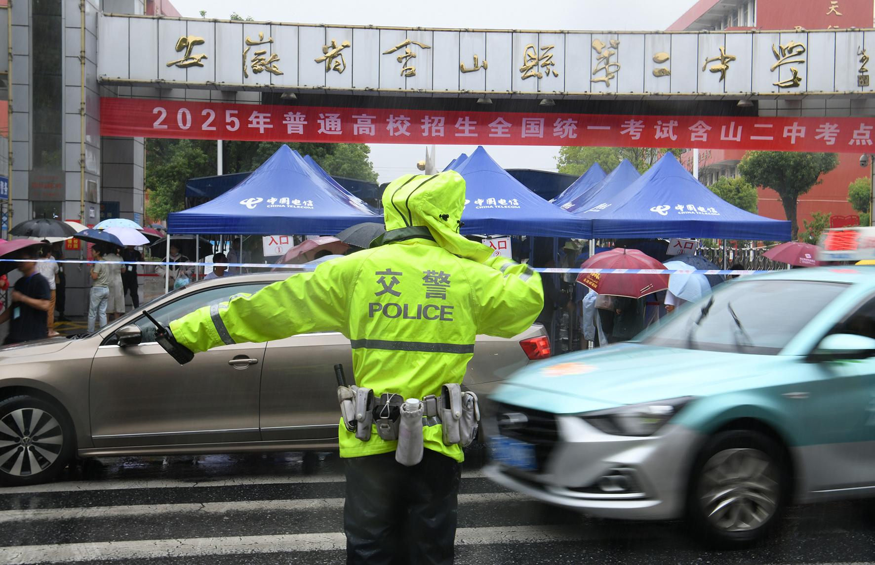 6月8日,江西省九江市公安局潯陽(yáng)分局民輔警冒雨在九江市三中考點(diǎn)指揮疏導(dǎo)交通。