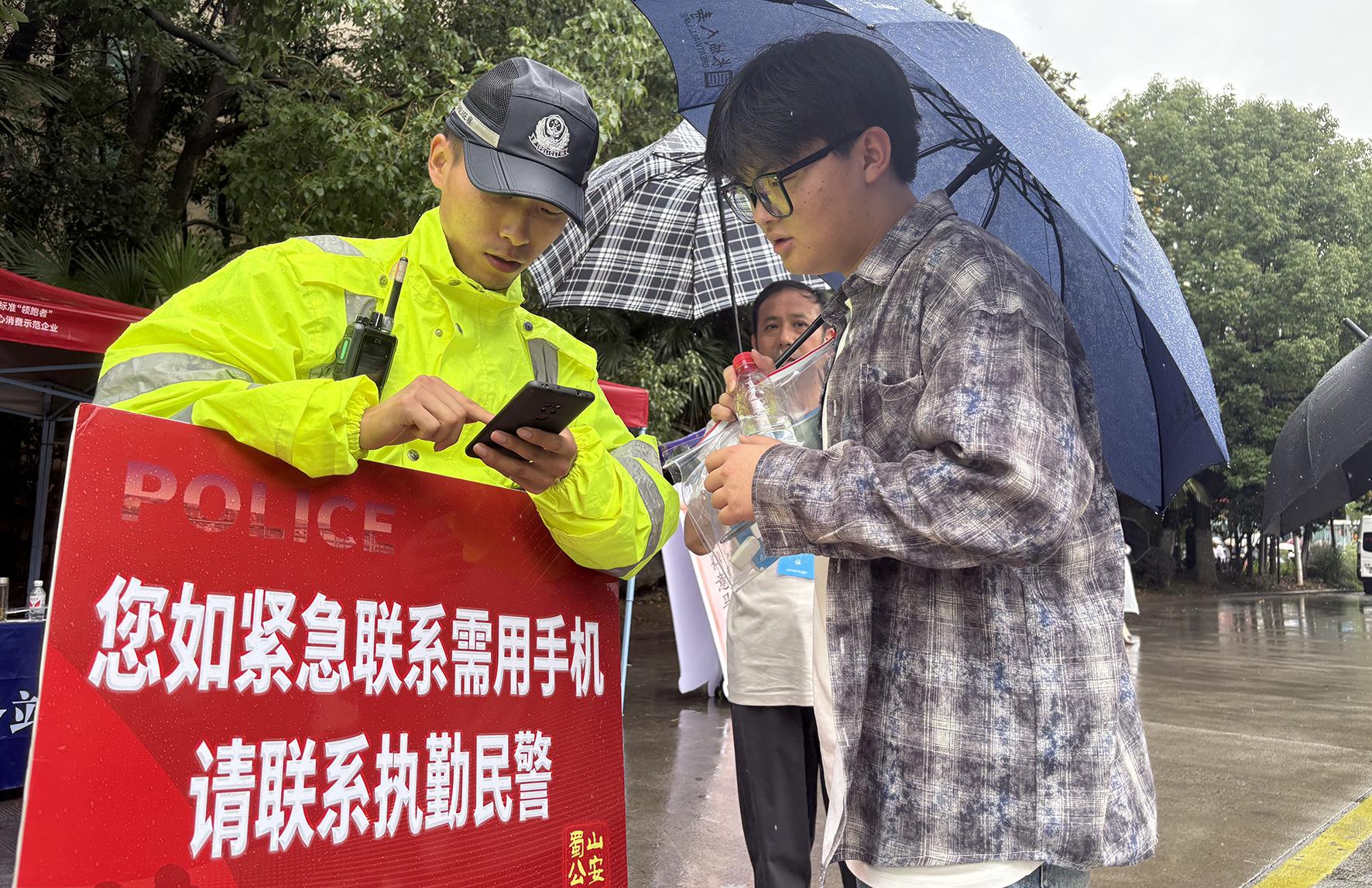 6月7日,安徽省馬鞍山市公安局雨山分局民警在考點(diǎn)外頂風(fēng)冒雨,全力維護(hù)考點(diǎn)周邊秩序。