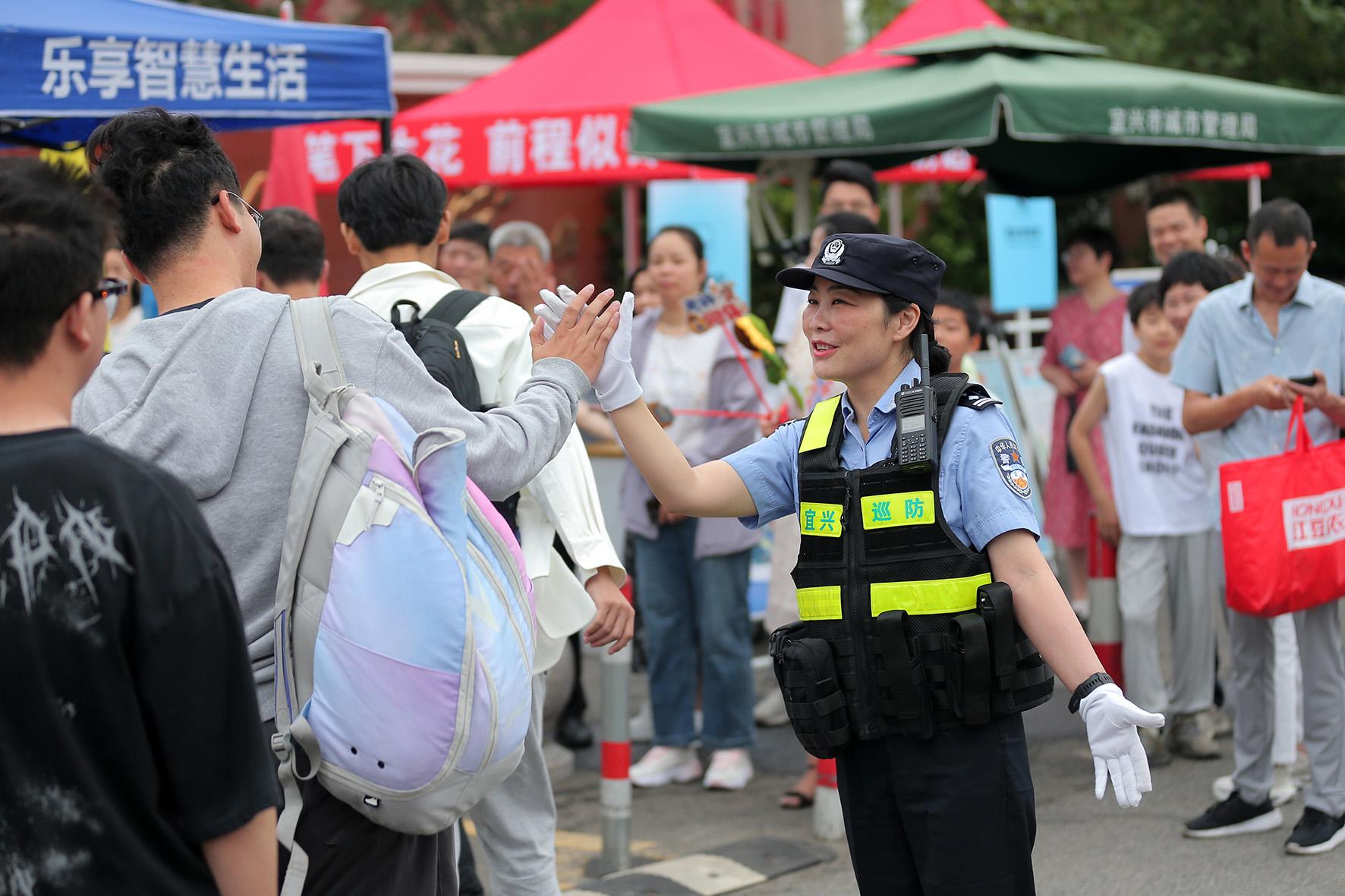 6月7日,江蘇省宜興市公安局環(huán)科園派出所社區(qū)民警在宜興市第二高級(jí)中學(xué)考點(diǎn)為考生護(hù)航加油。
