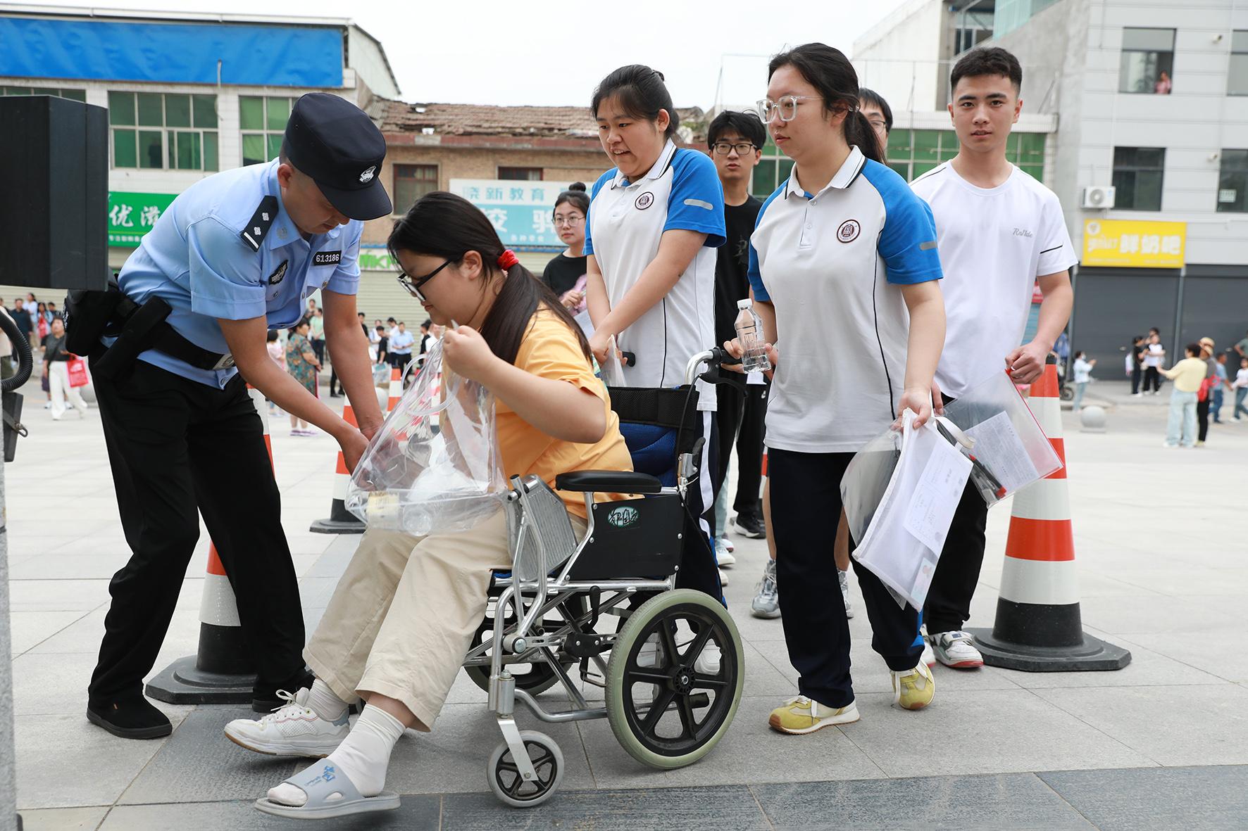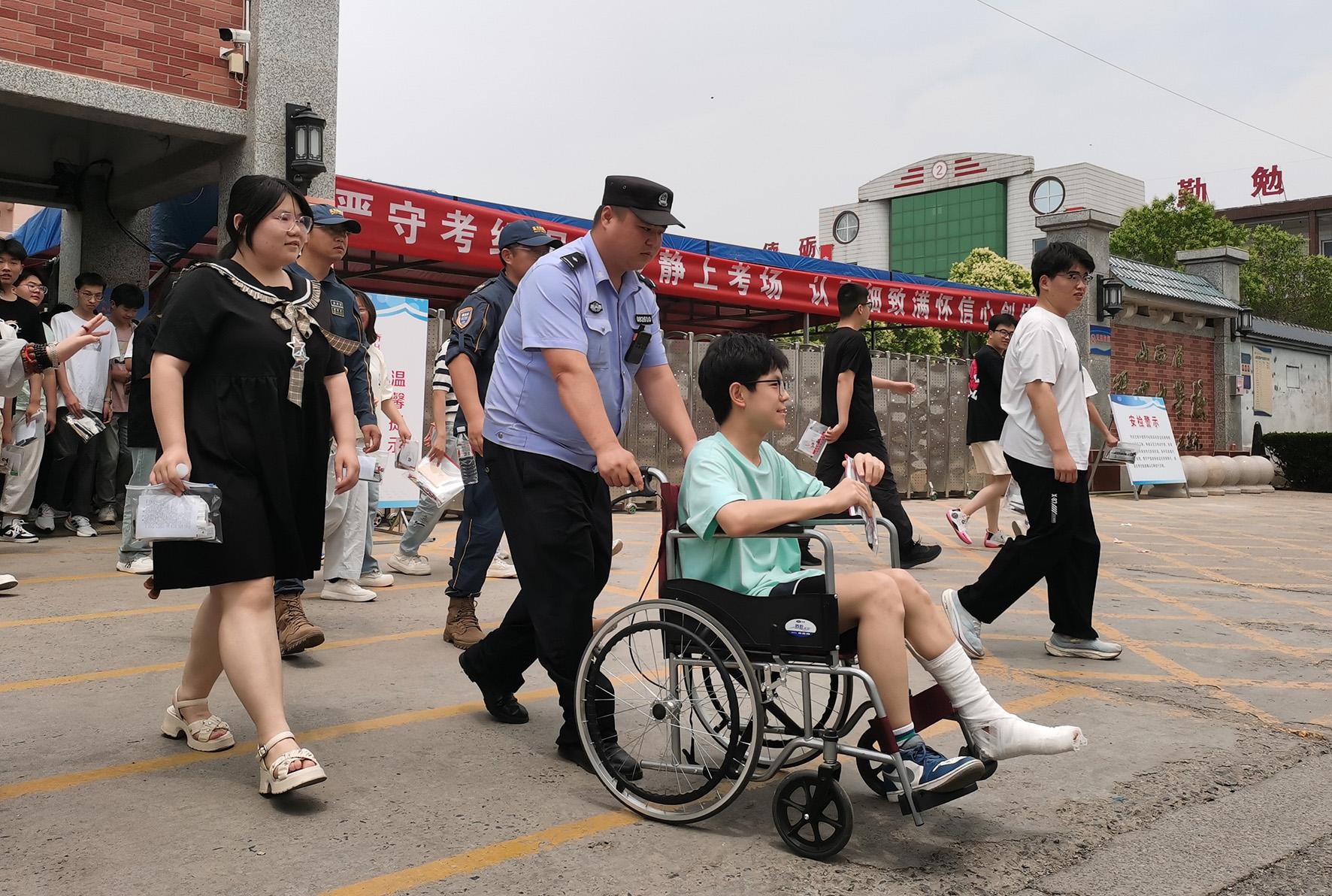 6月7日,陜西省富平縣公安局執(zhí)勤民輔警正在幫助受傷考生進(jìn)入考場(chǎng)。