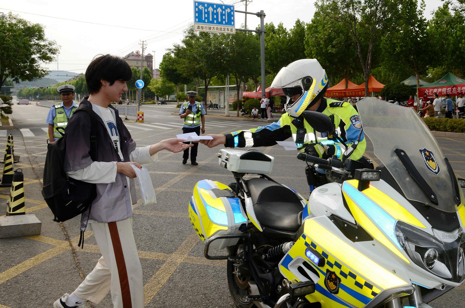 6月7日,在湖北省荊門市龍泉中學(xué)高考考點(diǎn),荊門市公安局交警支隊(duì)民警在疏導(dǎo)送考車輛。