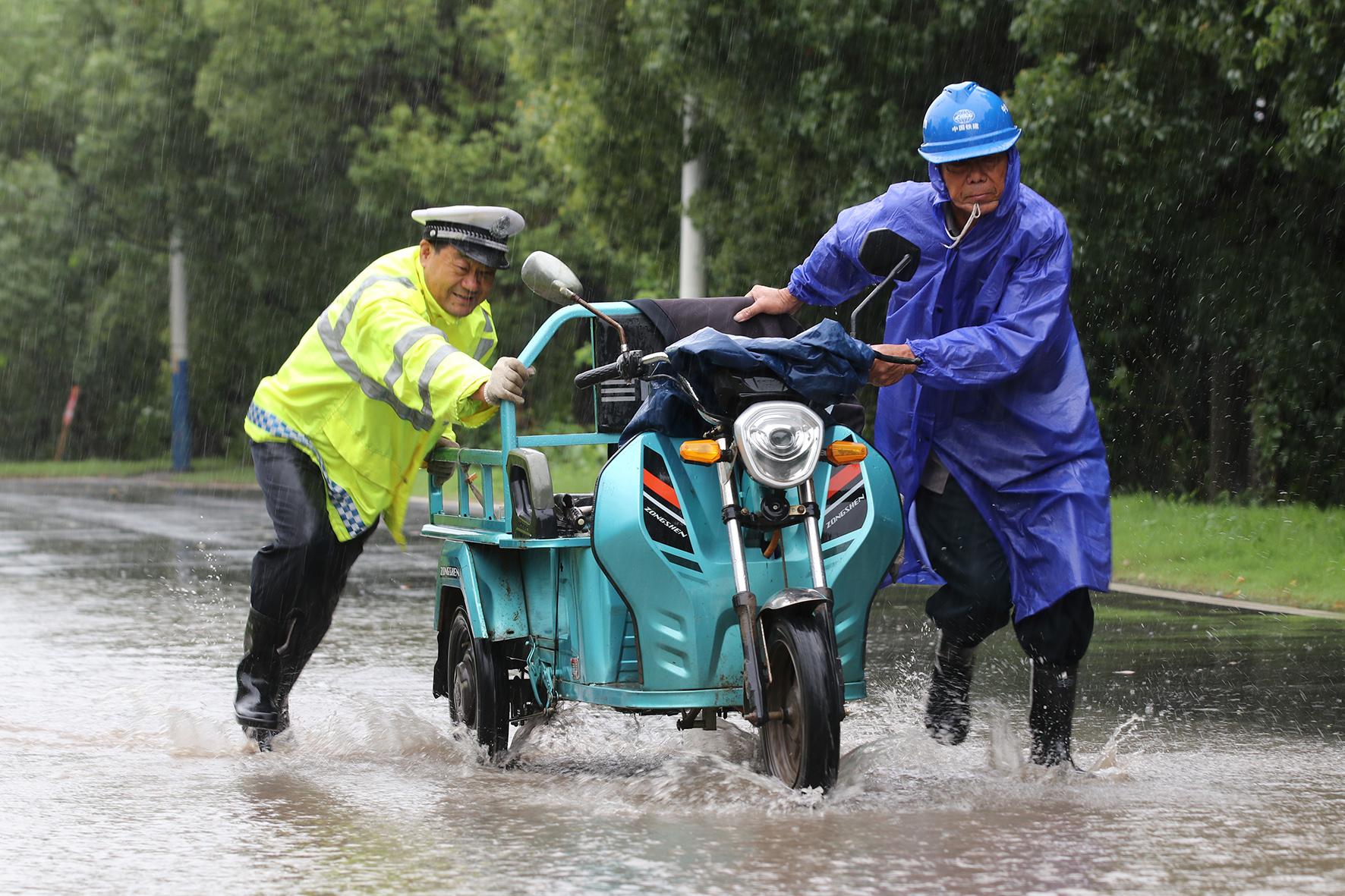 圖為民警在二壩鎮(zhèn)長(zhǎng)江路幫助村民將故障三輪車推出積水路面。