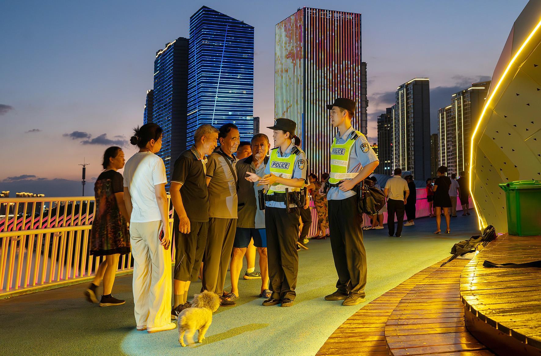 圖為7月3日晚,民警在永寧江景觀橋巡邏,并向群眾宣傳夏季安全防護(hù)知識(shí)。