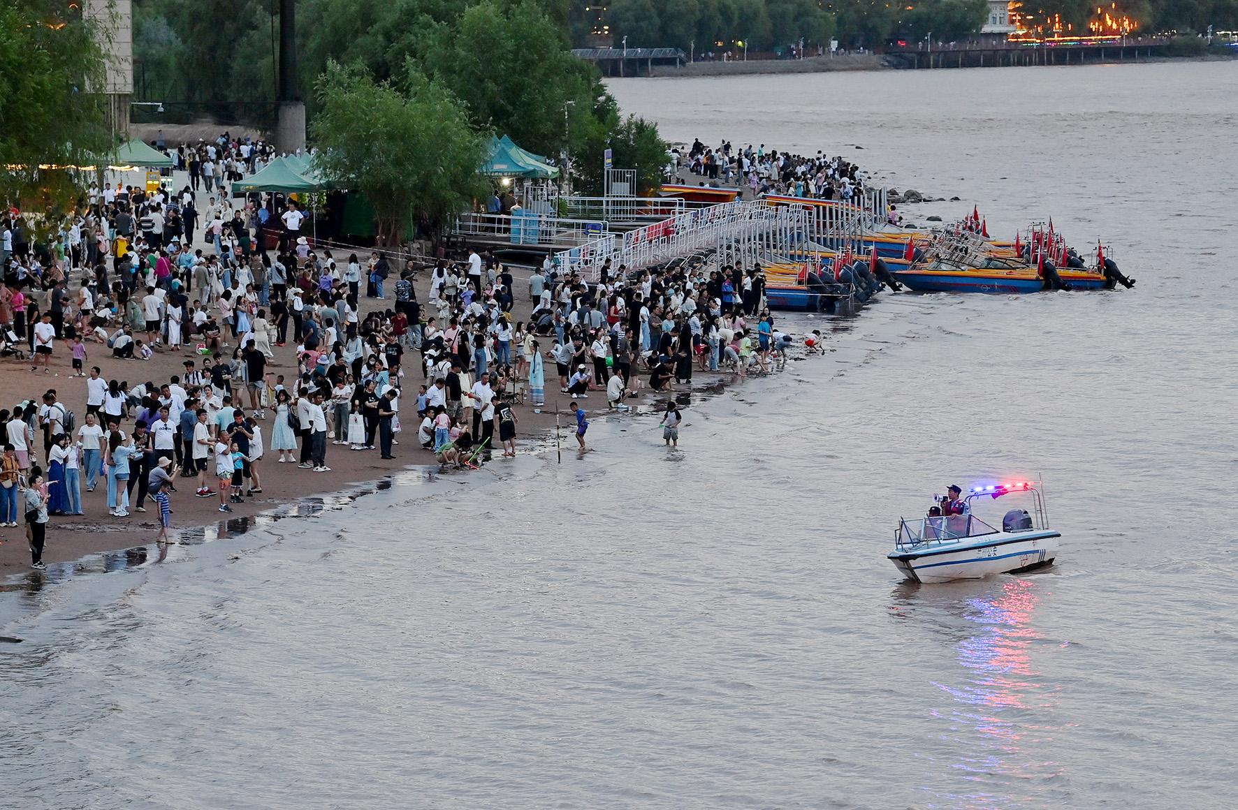 圖為7月3日晚,民警在黃河巡邏,提醒游客注意安全。