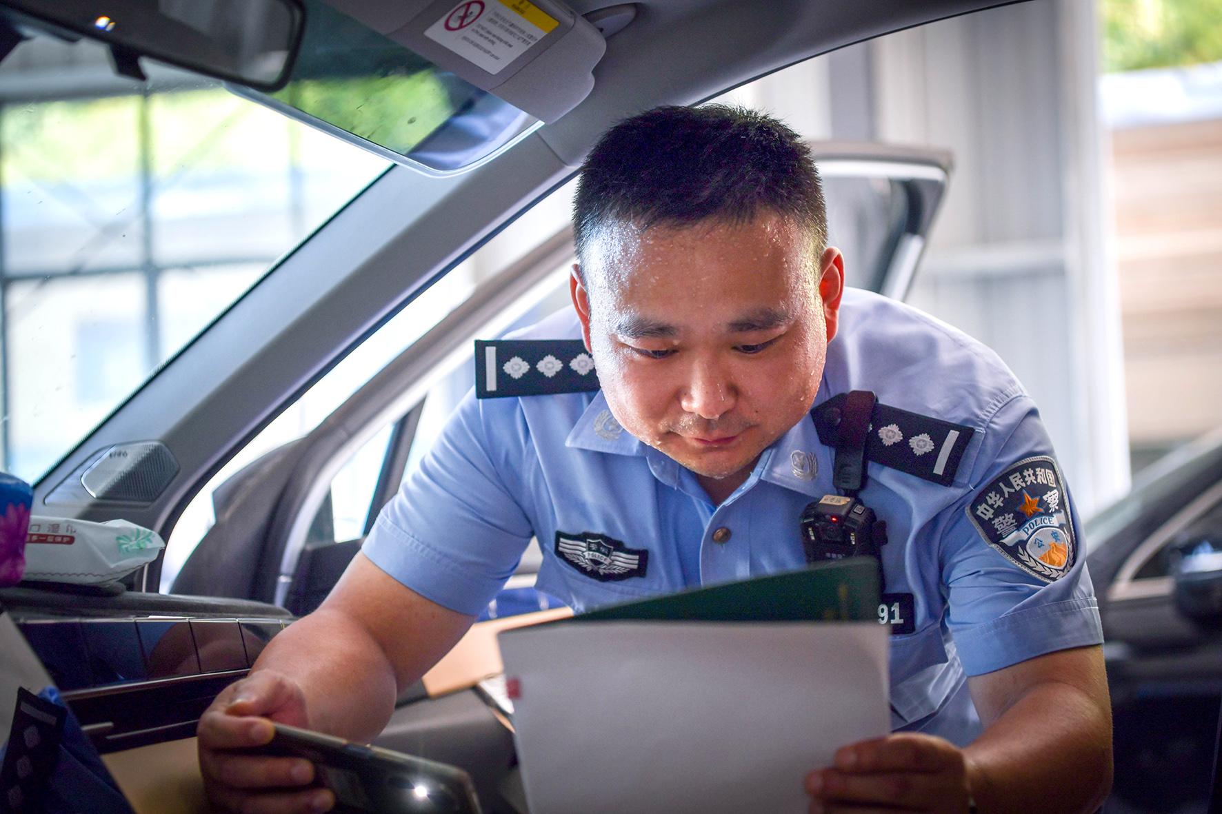 7月7日,小暑節(jié)氣。安徽省涇縣公安局交管大隊車管所民警在高溫下認(rèn)真檢查車輛信息。