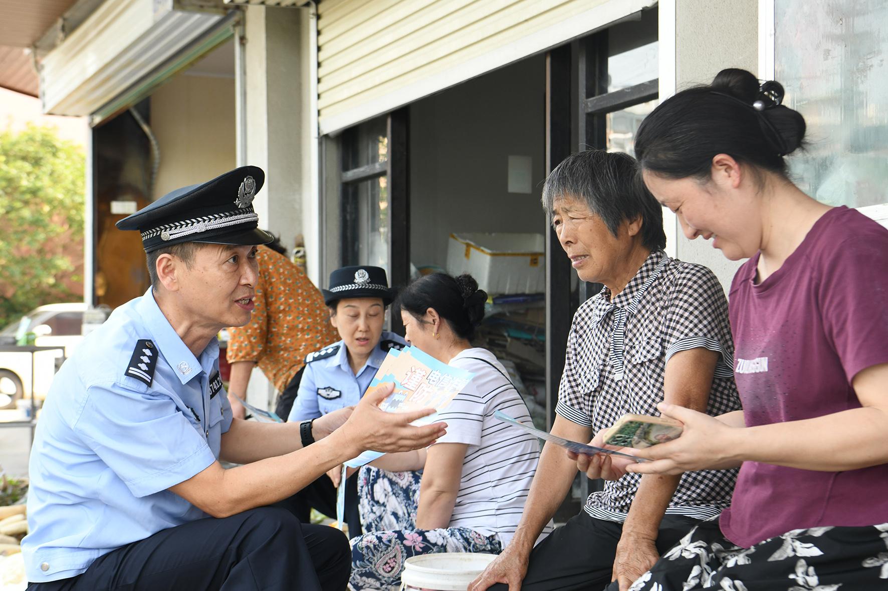 7月15日,安徽省馬鞍山市含山縣公安局環(huán)峰派出所組織民警走進(jìn)農(nóng)貿(mào)市場(chǎng)宣傳防范電信網(wǎng)絡(luò)詐騙知識(shí)。