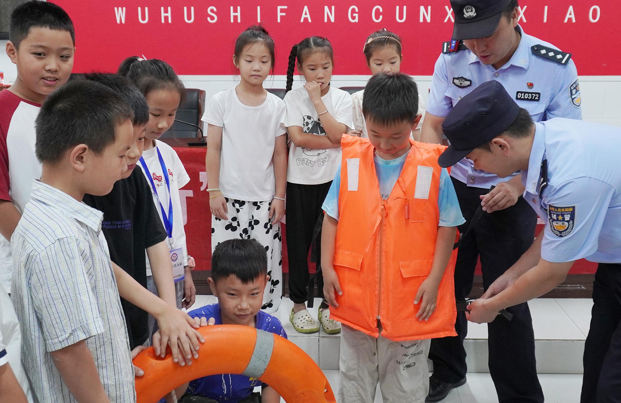 7月17日,在山東省臨沂市郯城縣郯城街道陵坡村,消防救援人員為放暑假的孩子們講解防溺水知識。