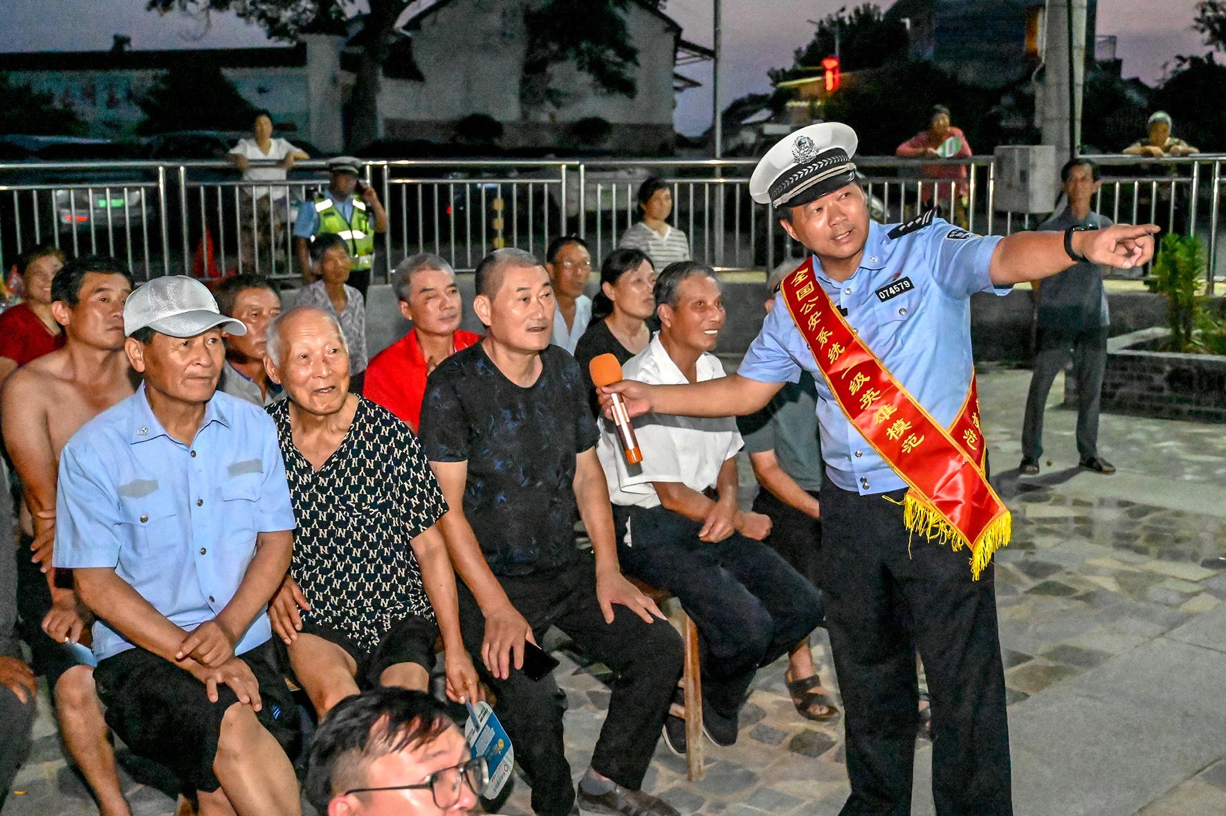 7月20日晚,在安徽省馬鞍山市和縣烏江鎮(zhèn)曹莊村,全國(guó)公安系統(tǒng)二級(jí)英雄模范、和縣公安局交管大隊(duì)民警杜昌來(lái)向村民開展交通安全宣講。