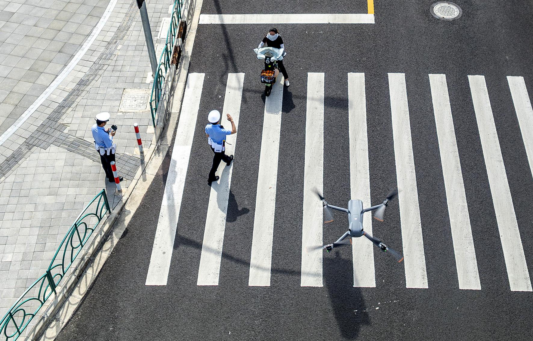 圖為7月22日,民輔警利用無(wú)人機(jī)查處一起非機(jī)動(dòng)車(chē)交通違法行為。