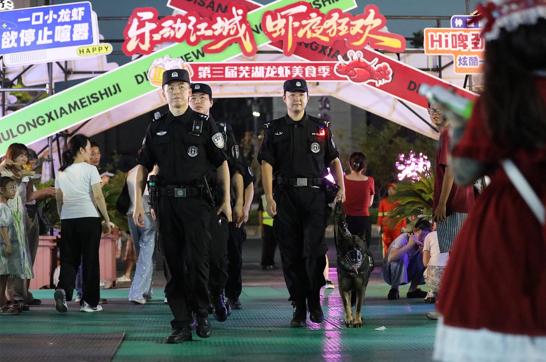 7月25日,安徽省蕪湖市公安局弋江分局特巡警大隊民輔警在蕪湖奧體中心“龍蝦美食季”夜市執(zhí)勤。