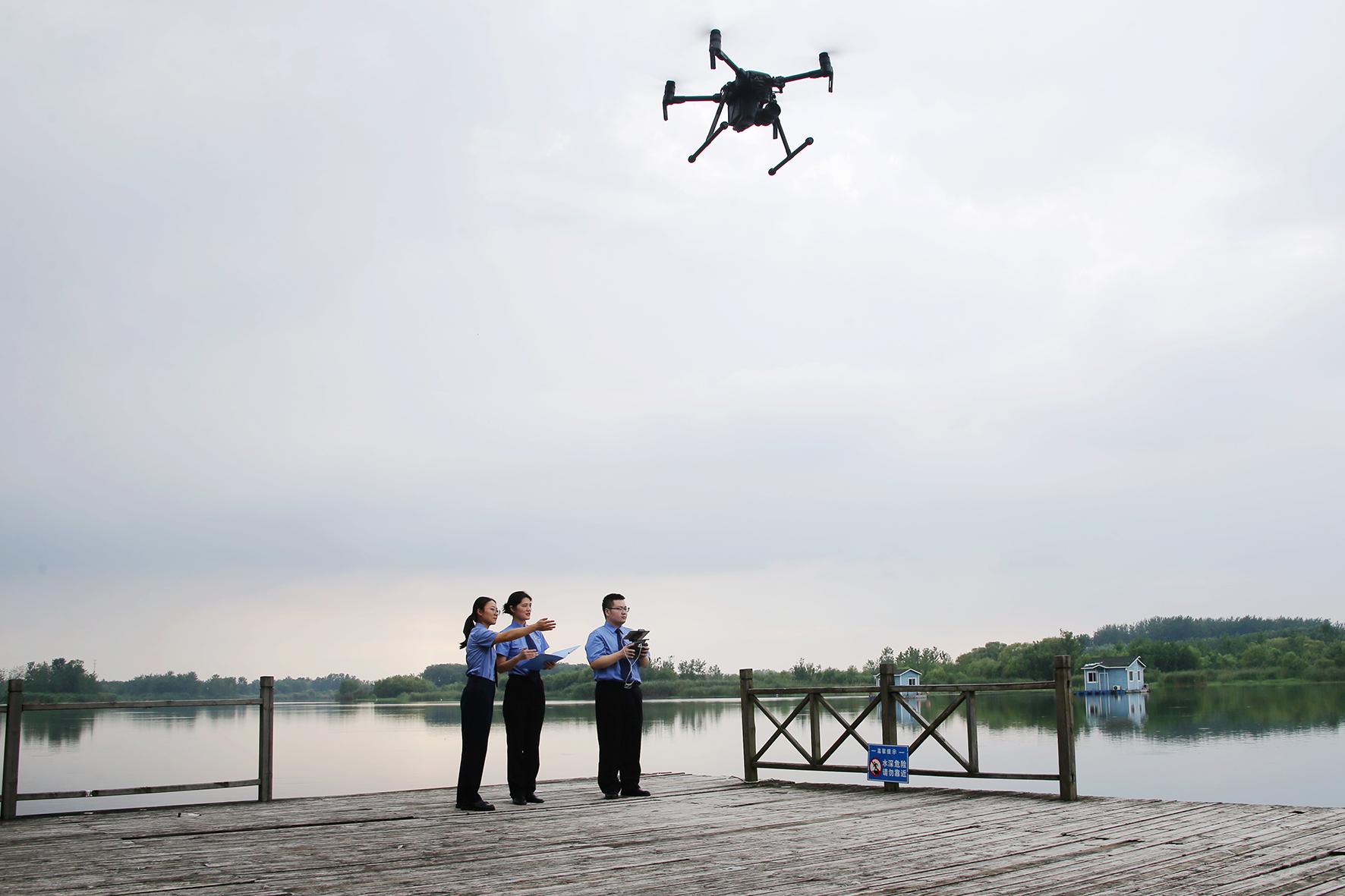 圖為8月12日,在全國(guó)生態(tài)日到來之際,公益訴訟辦案團(tuán)隊(duì)對(duì)古黃河飲用水源地開展無(wú)人機(jī)巡查。