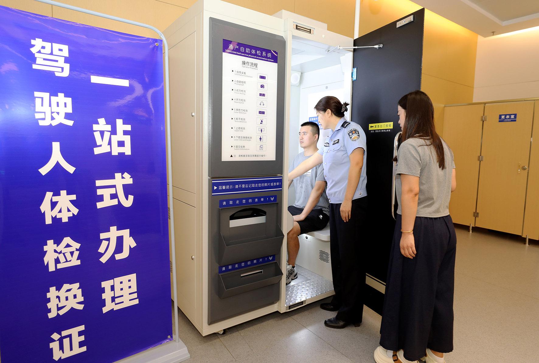 8月20日,安徽省淮北市政務(wù)服務(wù)大廳公安綜合窗口,工作人員指導(dǎo)換領(lǐng)駕駛證的群眾使用智能體檢設(shè)備。當(dāng)日,淮北市政務(wù)服務(wù)大廳公安綜合窗口駕駛?cè)酥悄茏灾w檢機(jī)投入使用,設(shè)備配備AI輔助診斷系統(tǒng)和后臺(tái)醫(yī)生審核。