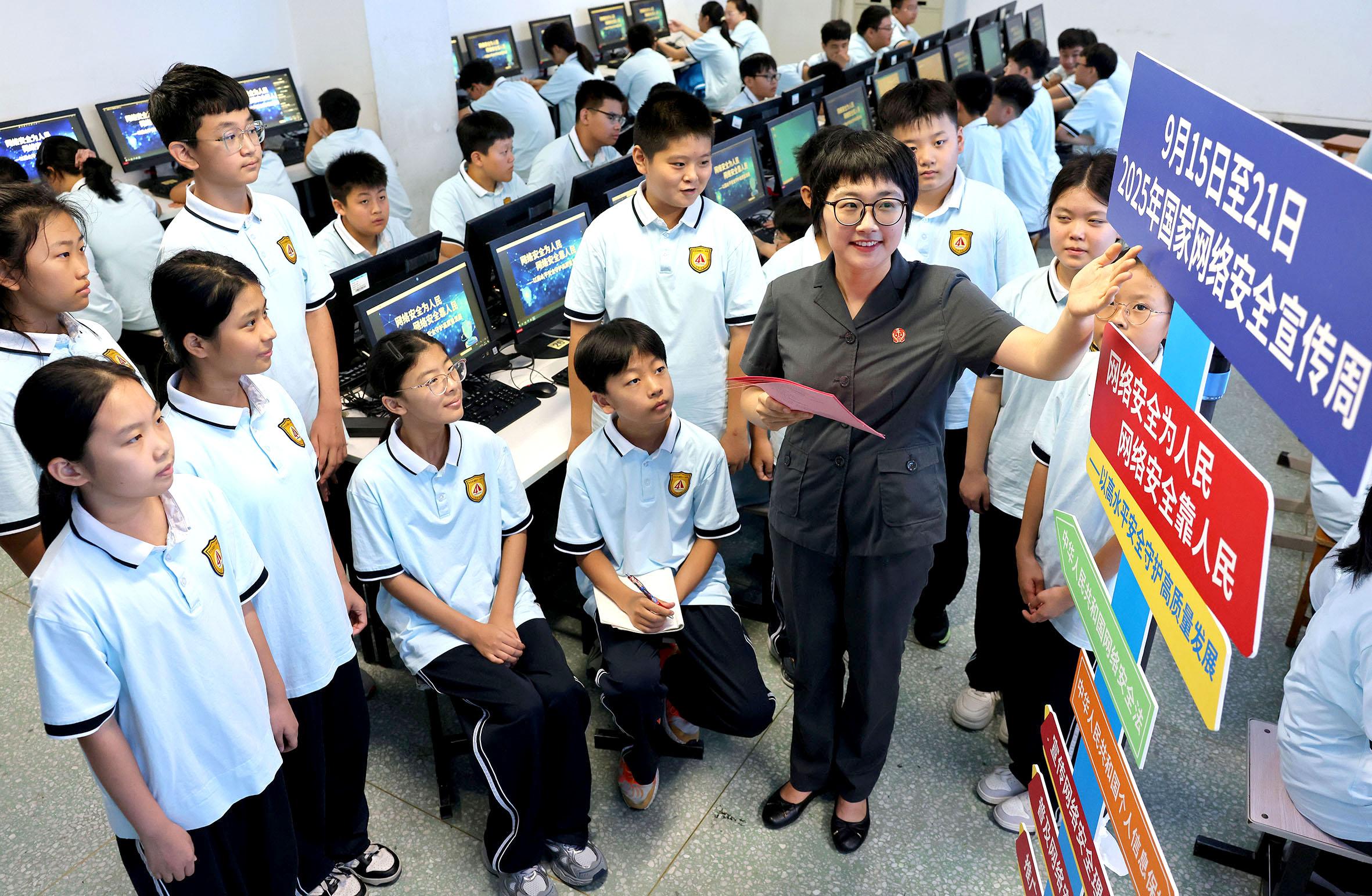 9月15日,在山東省棗莊市第四十一中學,棗莊市市中區(qū)人民法院的法官為學生們普及網(wǎng)絡(luò)安全知識。