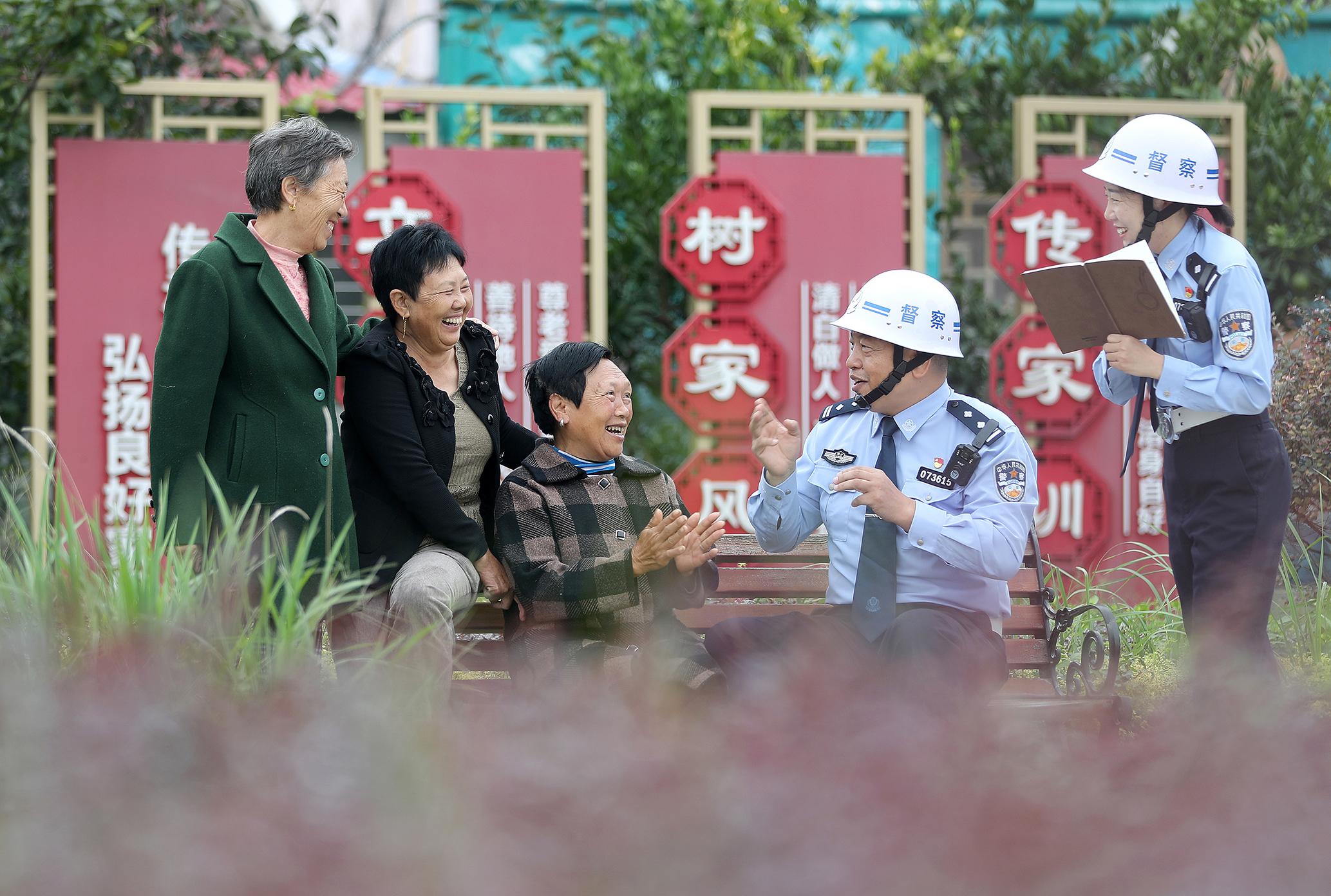 9月22日,在湖北省荊門市沙洋縣三峽土家族村,沙洋縣公安局督察大隊民警與村民“嘮家?!保瑑A聽群眾對公安服務(wù)的需求與建議。