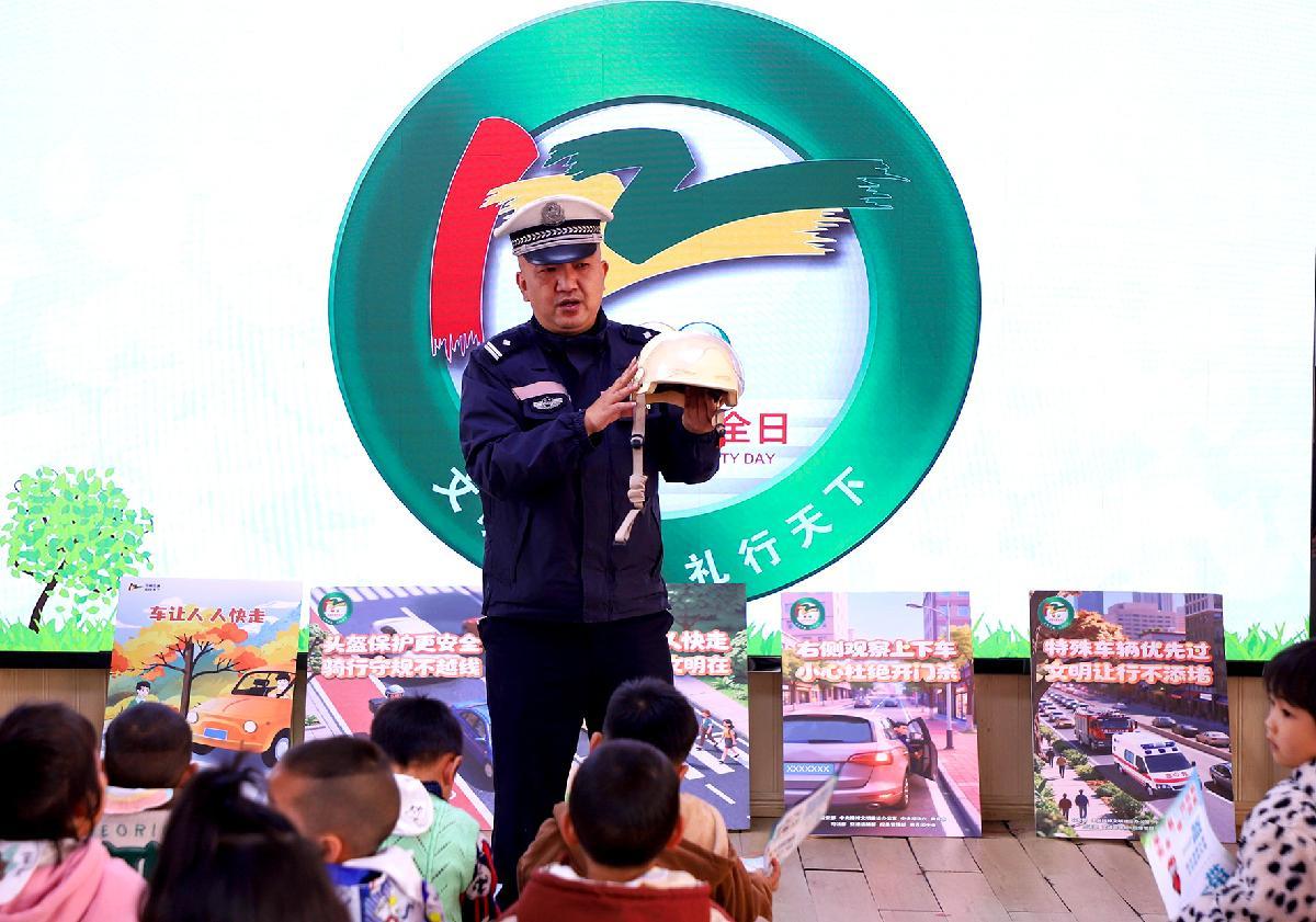12月1日,貴州省丹寨縣公安局交通警察大隊民警走進轄區(qū)第二幼兒園開展“文明交通 禮行天下”交通安全宣傳。