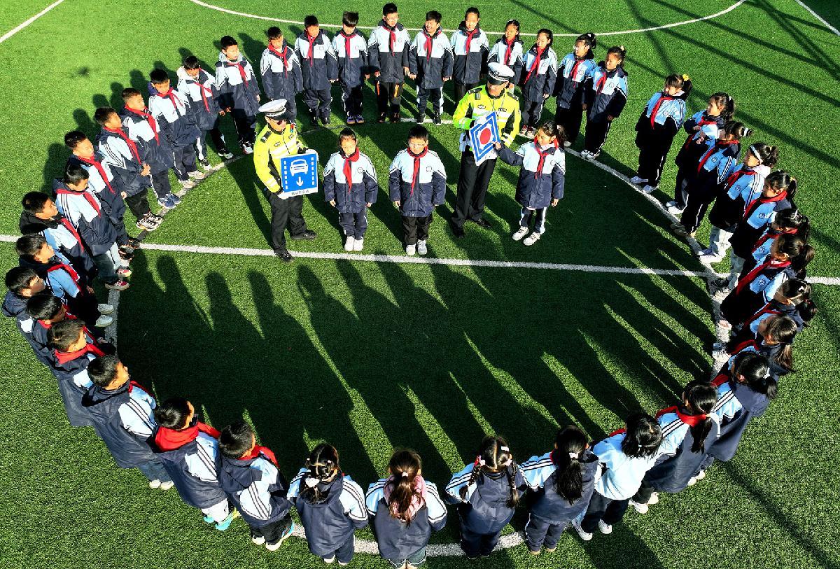 12月1日,在江蘇省連云港市院前小學(xué),連云港市公安局交警支隊連云大隊民警為學(xué)生講解交通安全知識。