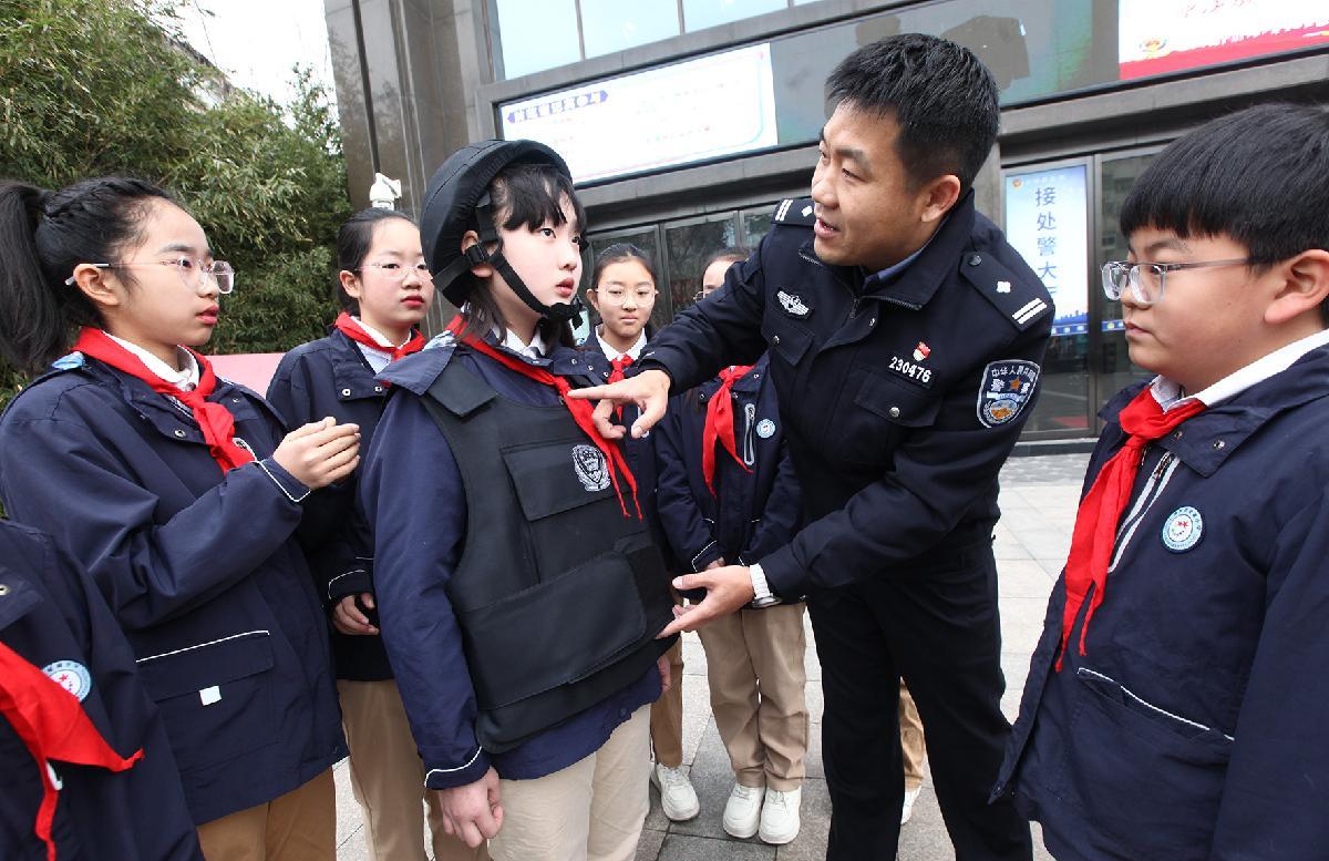 1月9日,江蘇省徐州市公安局鼓樓分局豐財(cái)派出所民警給小學(xué)生介紹警用裝備知識(shí)。當(dāng)日,徐州市星源小學(xué)組織學(xué)生到豐財(cái)派出所參觀,了解警營文化,感受警察風(fēng)采,喜迎中國人民警察節(jié)。
